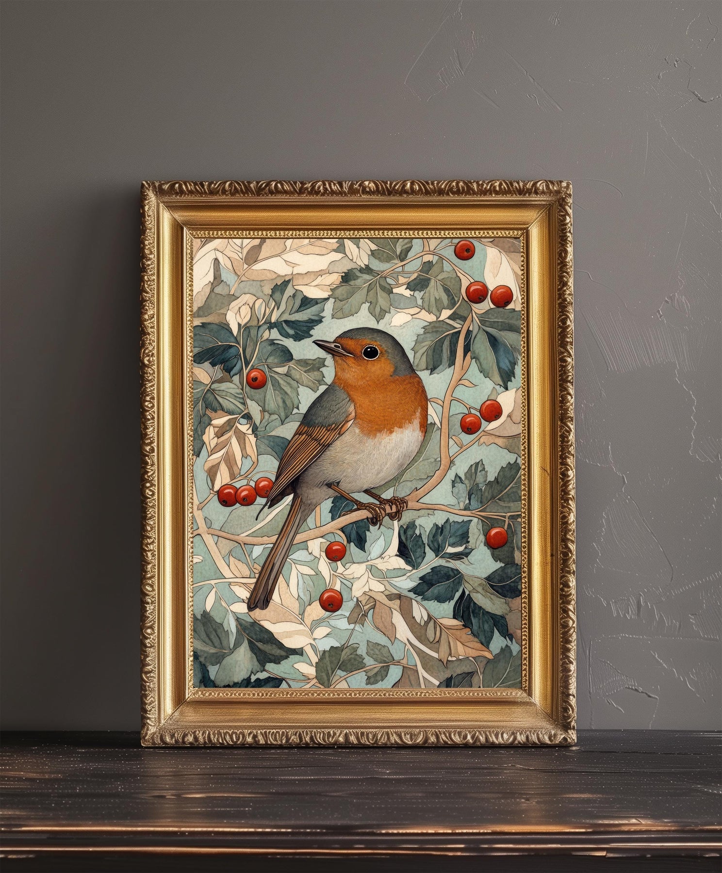 A beautiful William Morris–inspired art print featuring a robin perched among detailed hawthorn branches and blossoms. Designed in the rich decorative style of the Arts and Crafts movement, it blends natural charm with elegant pattern work — perfect for classic interiors or countryside homes.