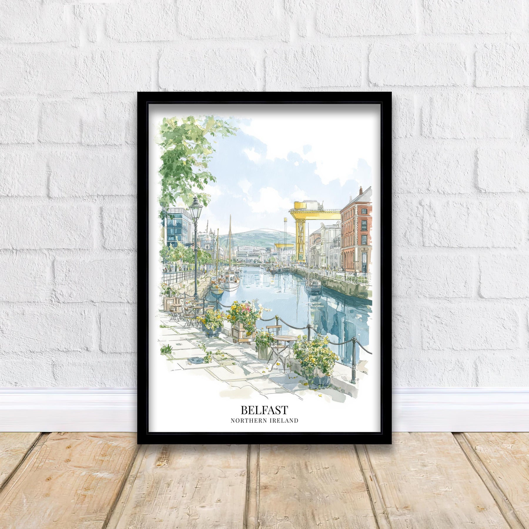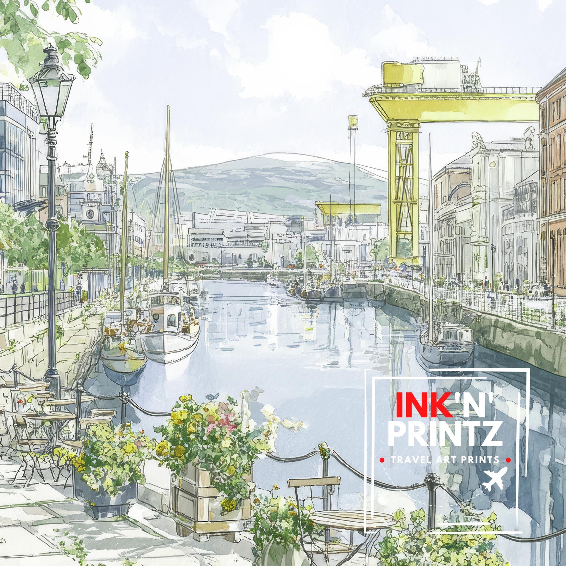 Capture the essence of Belfast, Northern Ireland, with this beautiful watercolor painting. Known for its mix of modern architecture, historic sites, and vibrant culture, Belfast is a city rich in history and beauty. This watercolor print showcases the city’s iconic landmarks, from the Titanic Museum to the vibrant streets and riverside views. Perfect for lovers of Northern Ireland, cityscapes, or anyone enchanted by Belfast’s unique charm, this painting brings the spirit of this lively city into your home.