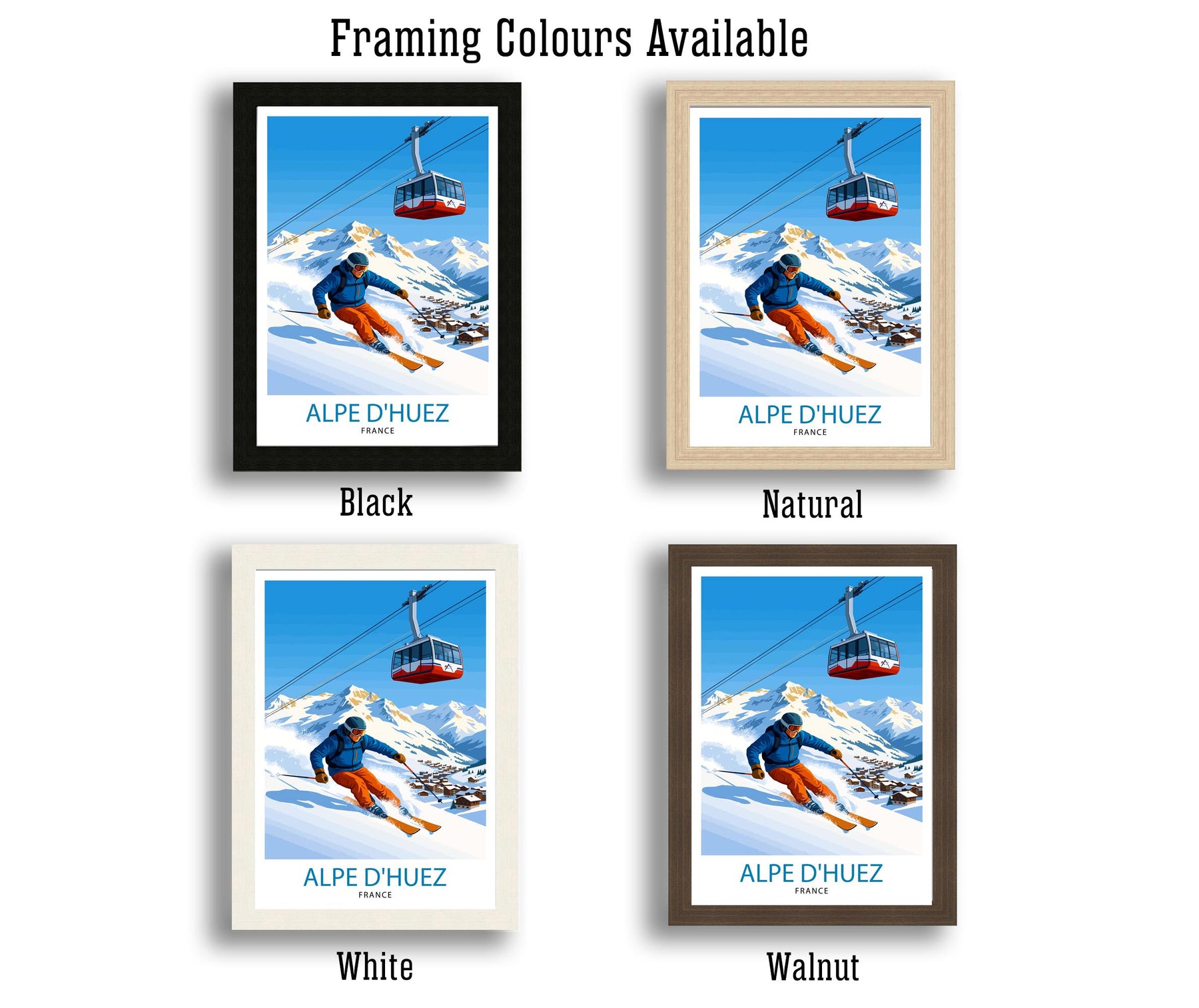 Celebrate the charm of the French Alps with this Alpe dHuez ski poster print. Featuring snow-covered peaks, chairlifts, and sunlit alpine chalets, this artwork captures the atmosphere of one of France’s most famous ski resorts. Perfect for skiers, travellers, and admirers of mountain scenery, it adds a touch of winter adventure to any wall decor.