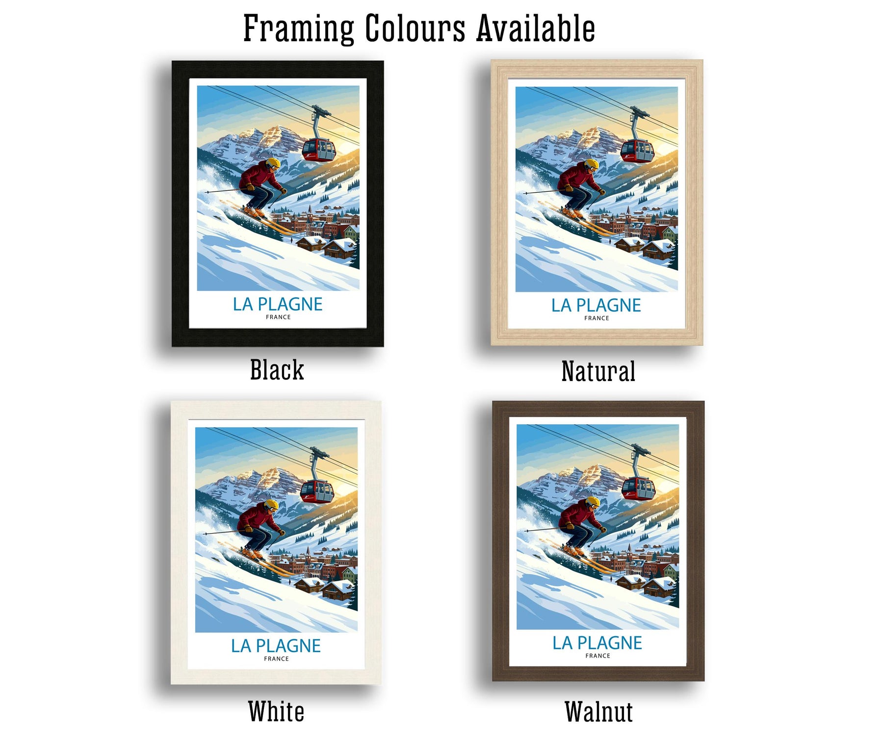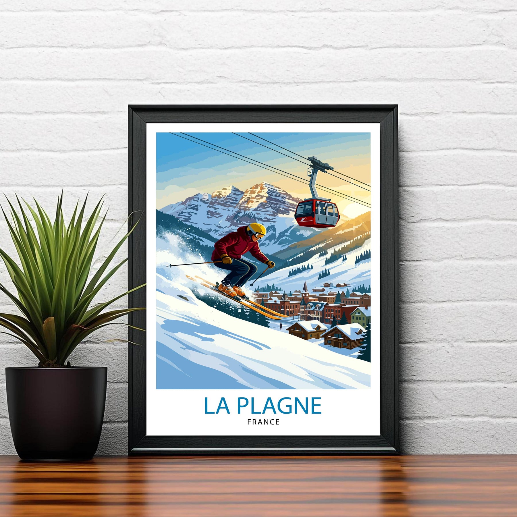 Celebrate the charm of the French Alps with this La Plagne ski resort poster print. Featuring snowy peaks, alpine chalets, and scenic slopes, this artwork captures the excitement and beauty of one of France’s most popular ski destinations. Perfect for skiers, travellers, and admirers of mountain scenery, it adds a touch of alpine adventure to any space.