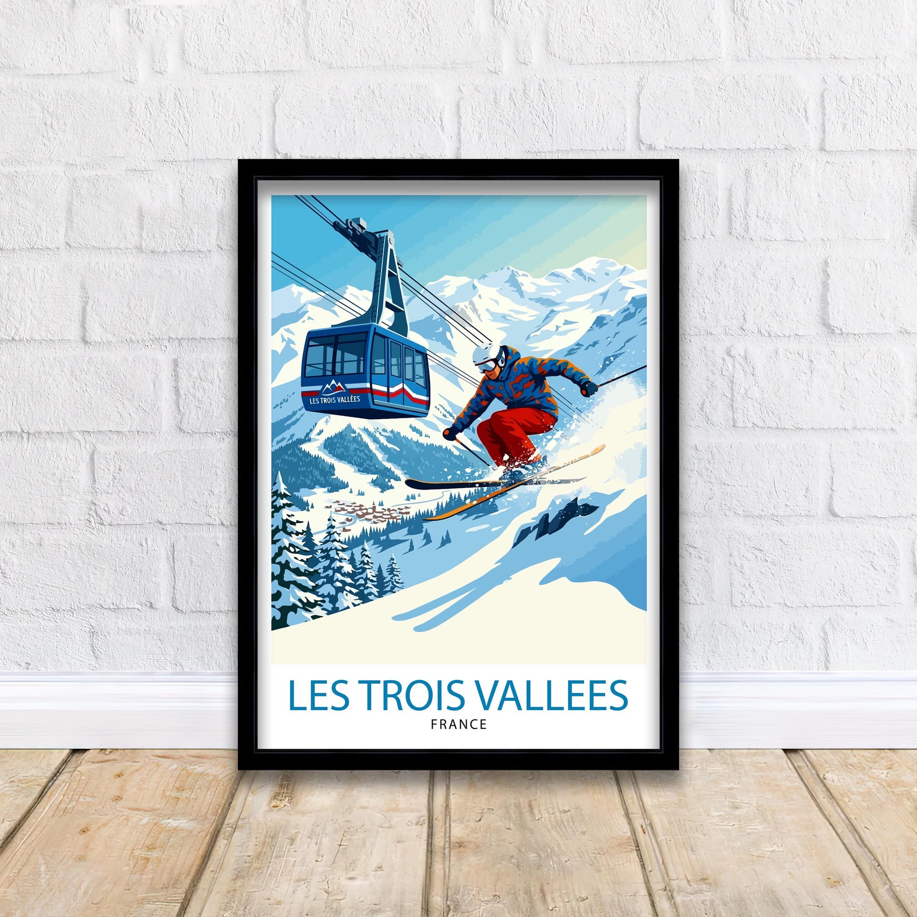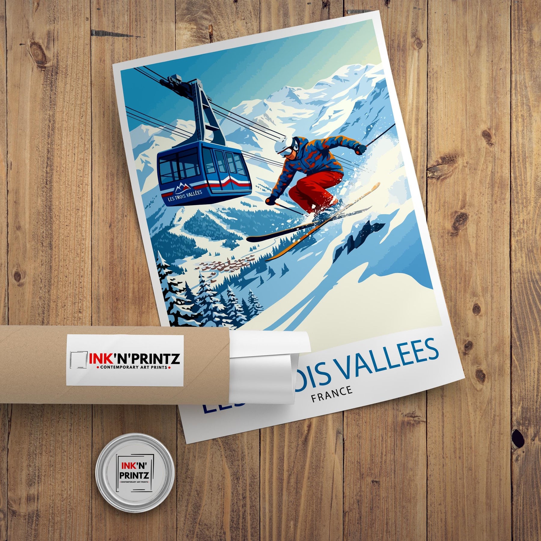 Les Trois Vallees Ski Poster Print France Wall Art Mountain Resort Landscape Gift for Europe Travel Lovers and Fans of Scenic French Alps