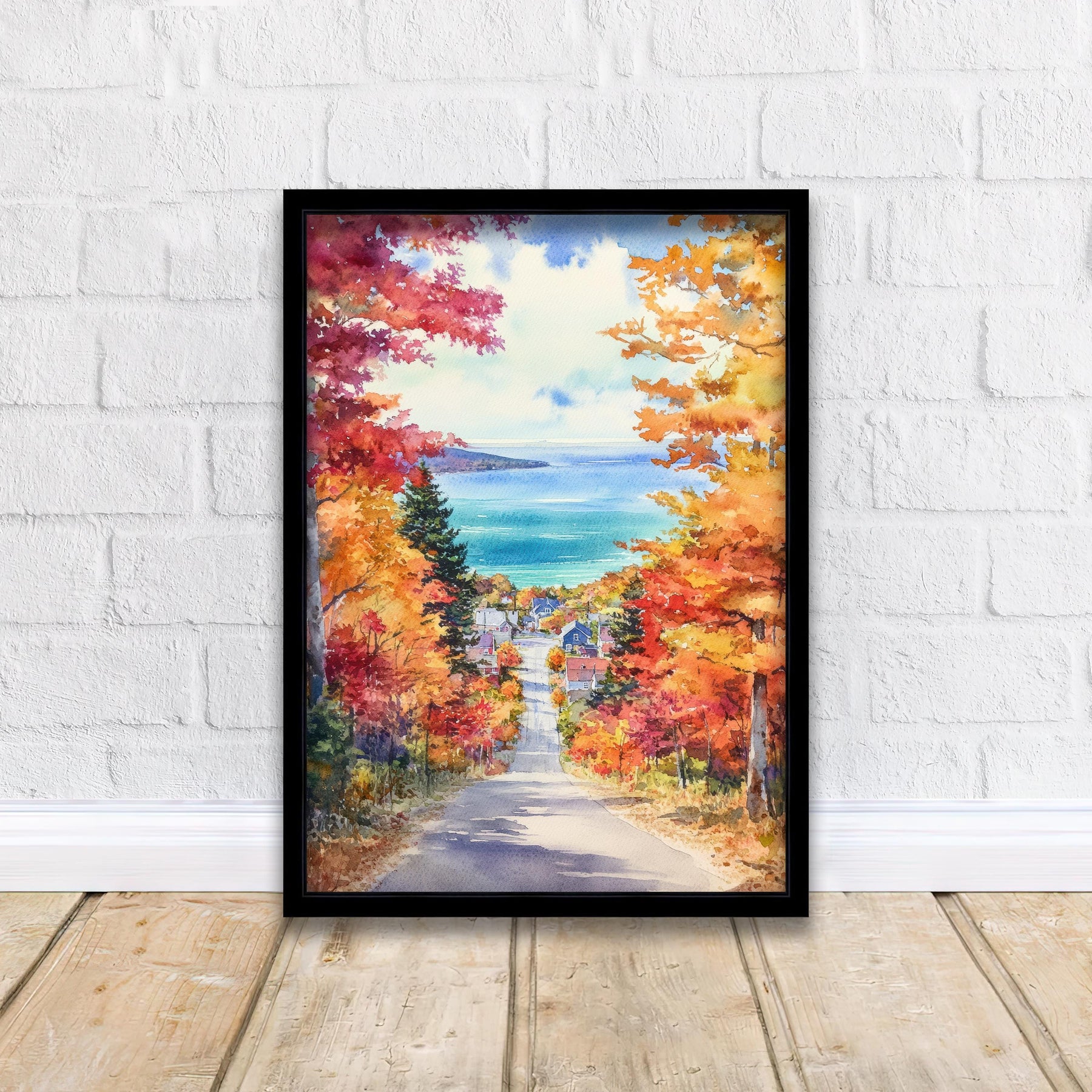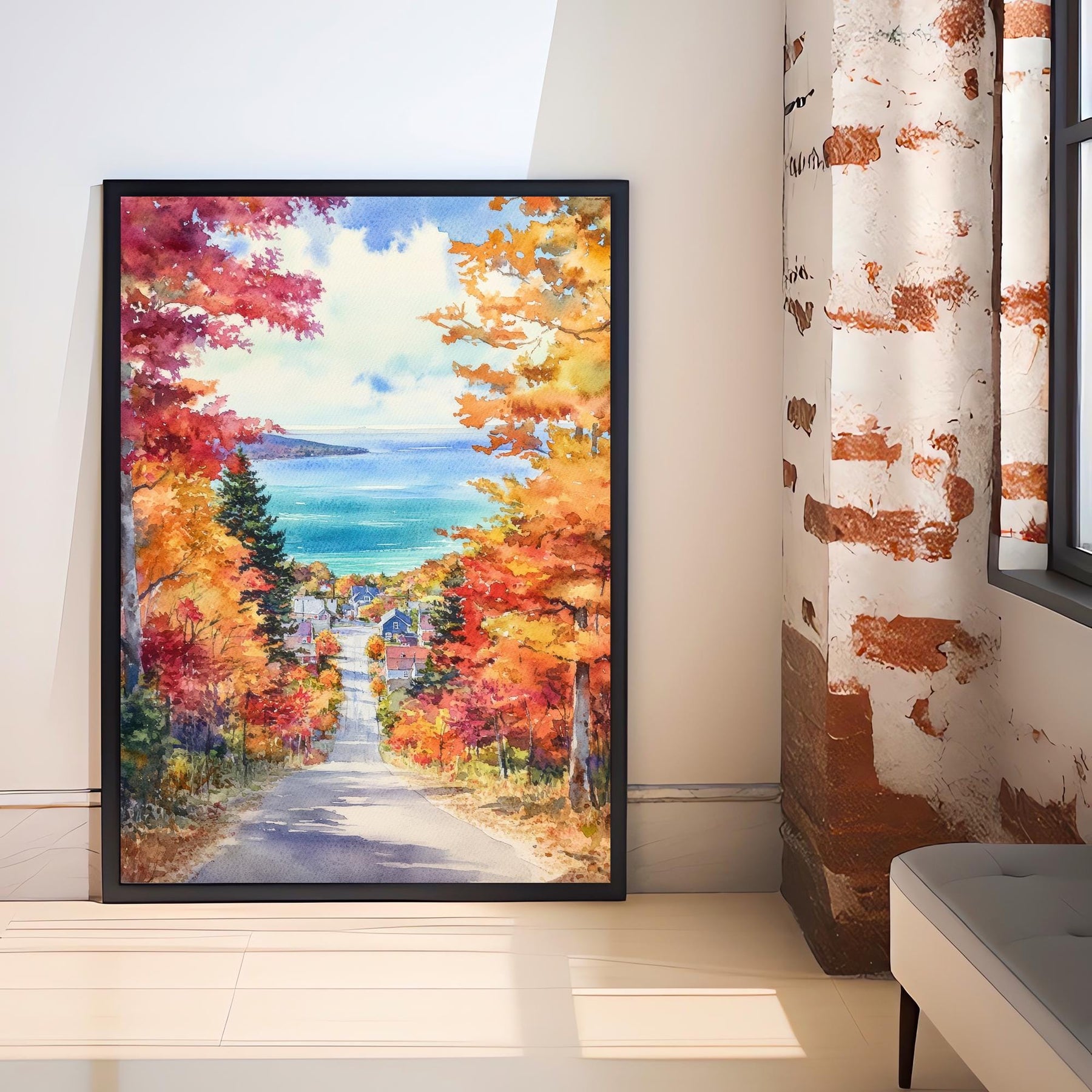 Celebrate the tranquil beauty of the Great Lakes region with this Michigan watercolor poster. Featuring lush forests, serene shorelines and expansive blue waters, this artwork captures the natural charm of America's Midwest. Soft watercolor washes create a calming atmosphere, making this piece ideal for travellers, lake lovers and admirers of U.S. landscapes.
