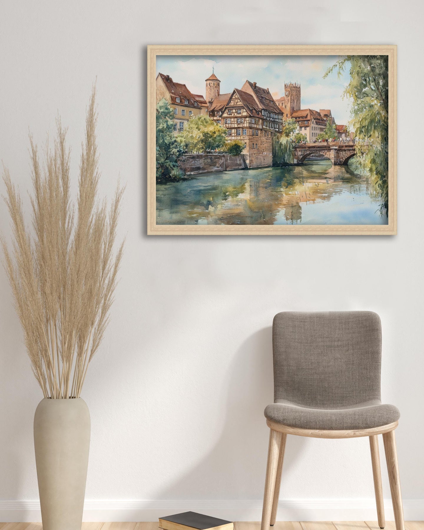 Nuremberg Landscape Painting Poster Germany Wall Art Historic City River Scene Print Gift for Europe Lovers and Fans of Scenic German