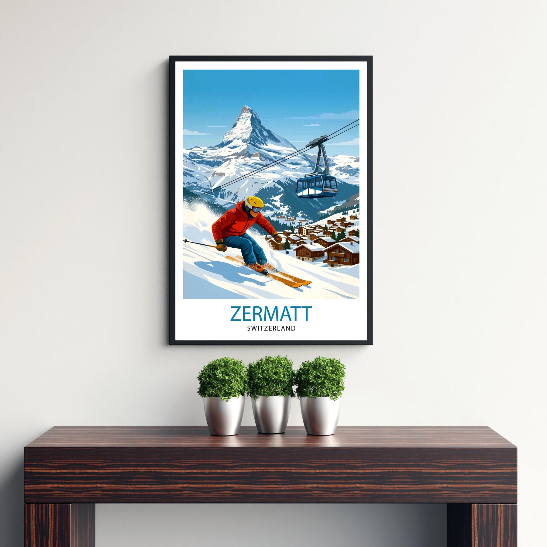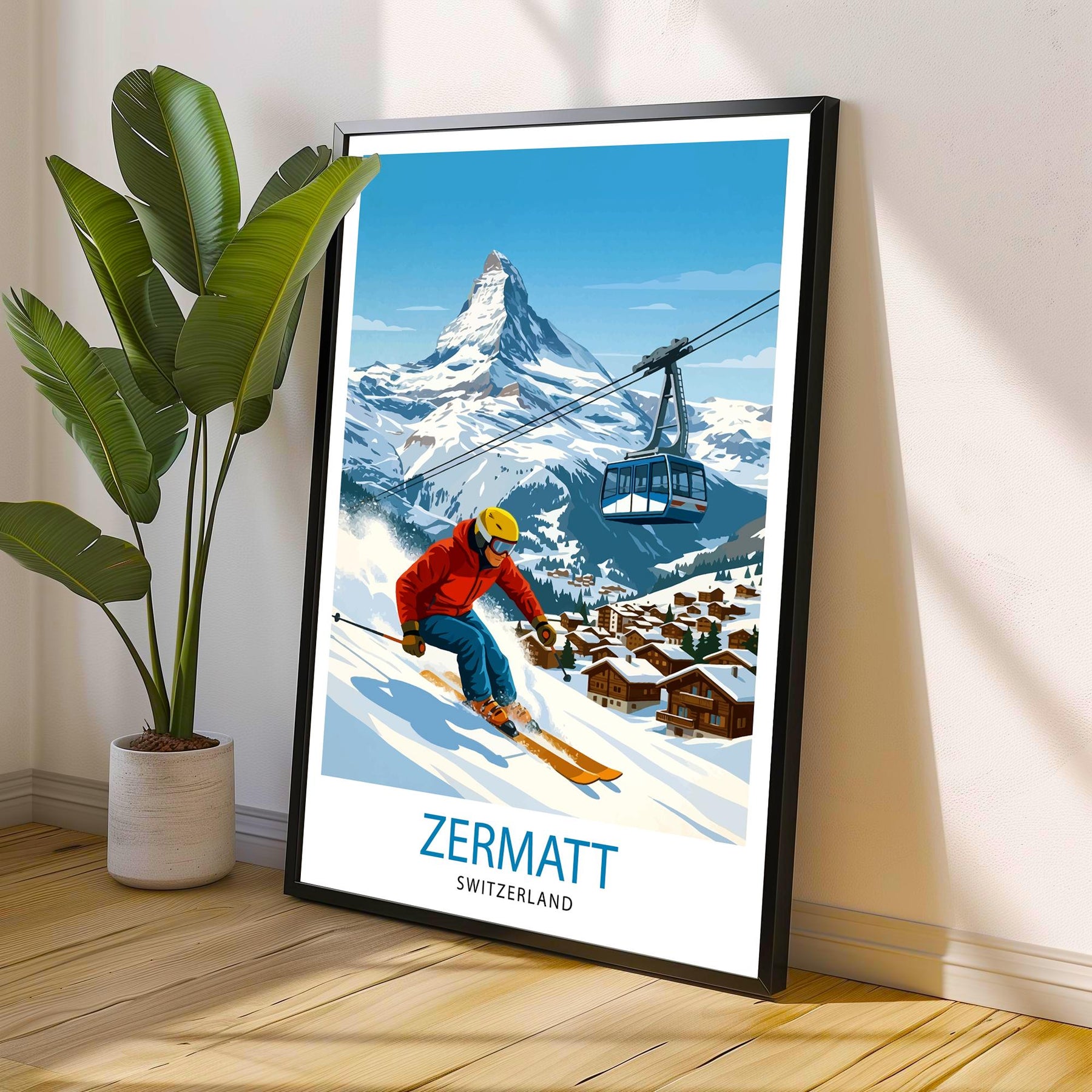 Bring the beauty of the Swiss Alps into your home with this Zermatt ski poster print. Featuring the iconic Matterhorn, charming alpine chalets, and snow-covered peaks, this artwork captures the elegance and adventure of one of Switzerland’s most famous ski resorts. Perfect for skiers, travellers, and mountain lovers, it adds a timeless alpine touch to any wall decor.