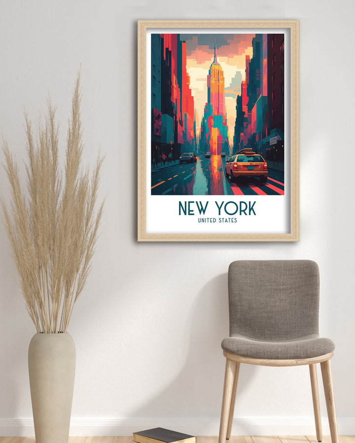 Bring the magic of the Big Apple into your home with this stunning New York travel print. Featuring iconic landmarks such as the Statue of Liberty, Empire State Building, and Brooklyn Bridge, this illustration captures the essence of this vibrant city. Perfect as a gift for any New York lover or as a statement piece in your own home, this travel poster will transport you to the city that never sleeps.