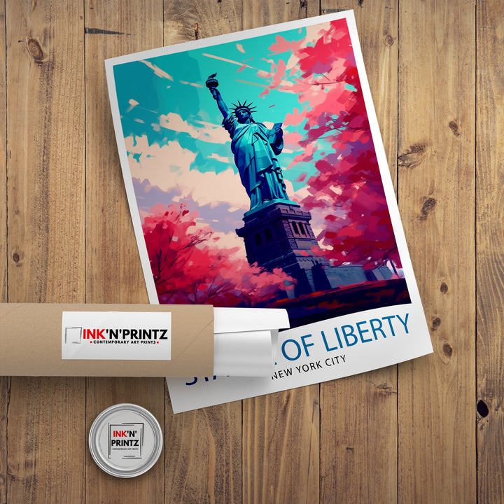 Celebrate the spirit of freedom and the iconic symbol of New York with this stunning Statue of Liberty travel print. Depicting Lady Liberty standing tall against the city skyline, this artwork captures the grandeur and significance of this American landmark. Display it in your home or office as a reminder of the values it represents - liberty, hope, and the pursuit of dreams.