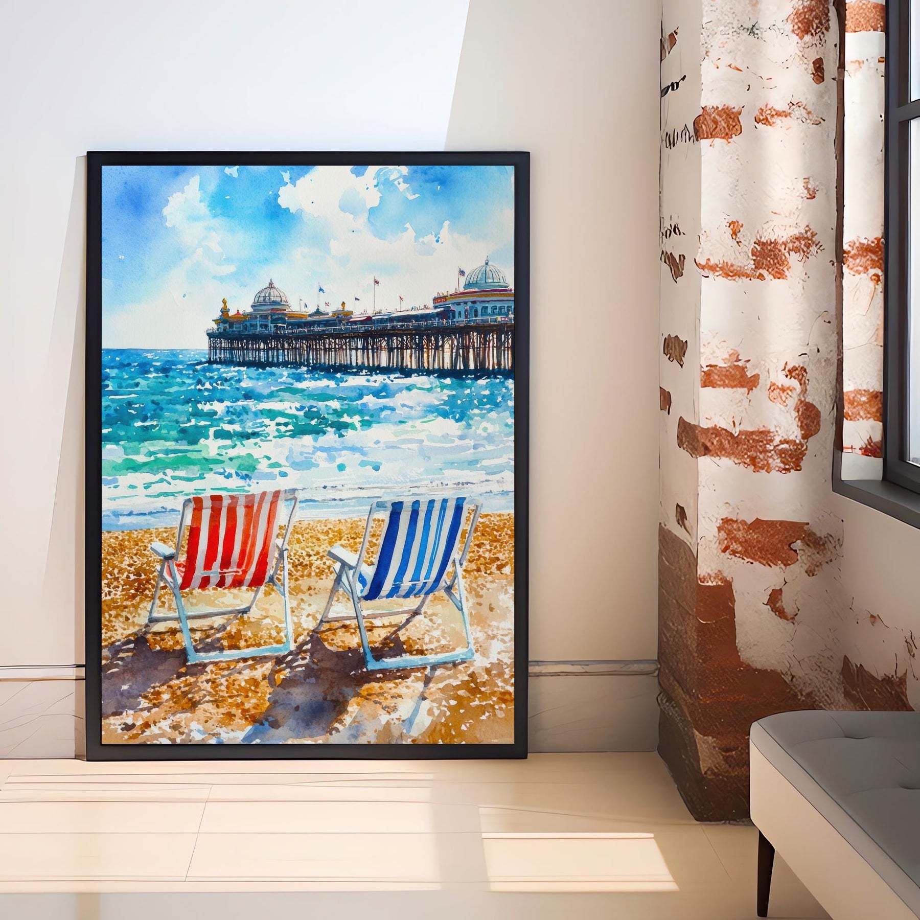 Bring the vibrant energy of the English coast into your home with this striking Brighton Palace Pier watercolour print. An iconic landmark stretching into the sea, Brighton Pier is famous for its lively amusement rides, classic arcade games, and breathtaking views of the Sussex coastline. The dynamic watercolour style captures the pier's bustling atmosphere and the beautiful interplay of light on the water, making it a perfect piece of UK seaside wall art, a nostalgic reminder of a favourite coastal getaway, or a colourful addition to beach-themed or vintage fairground decor.