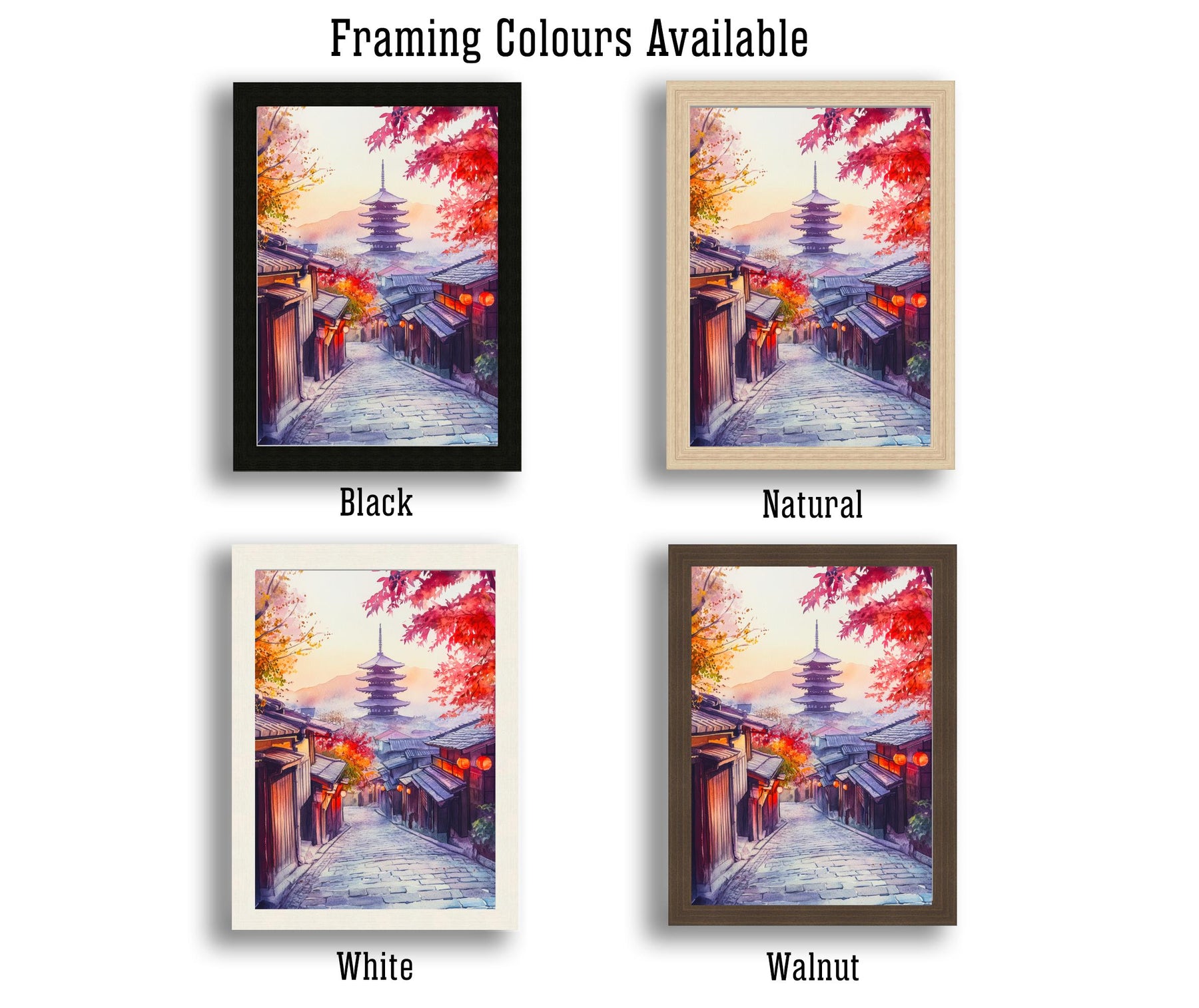 Immerse yourself in the ancient beauty of Japan with this serene Kyoto watercolour painting print. This artwork captures the timeless elegance of Japan's cultural capital, featuring iconic elements such as traditional pagodas rising above tranquil Japanese gardens, delicate cherry blossoms (sakura) in full bloom, or perhaps a glimpse of the historic Gion geisha district. The soft, harmonious watercolour palette evokes Kyoto's spiritual atmosphere and rich heritage, making it a perfect piece of Japanese art decor, a cherished memory for Japan travel enthusiasts, or an inspiring gift for anyone who loves Asian culture.