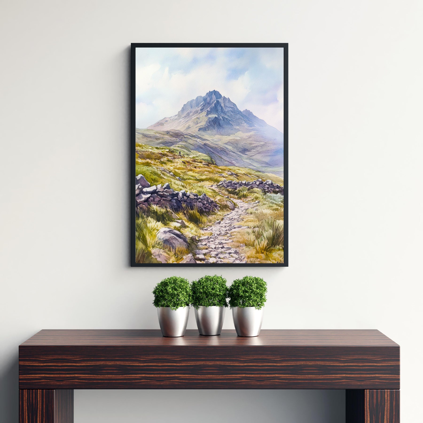 Bring the rugged beauty of the English countryside into your home with this stunning Peak District National Park watercolour print. This artwork captures the diverse and dramatic landscapes, from the rolling Derbyshire hills and expansive moorlands to the iconic gritstone edges and picturesque dales. The gentle, layered washes of watercolour evoke the serene, untamed beauty and ever-changing light of this cherished protected area. It's a perfect piece for lovers of UK hill walking, a nostalgic souvenir of rural England travel, or a tranquil natural scene for any country-inspired home decor.