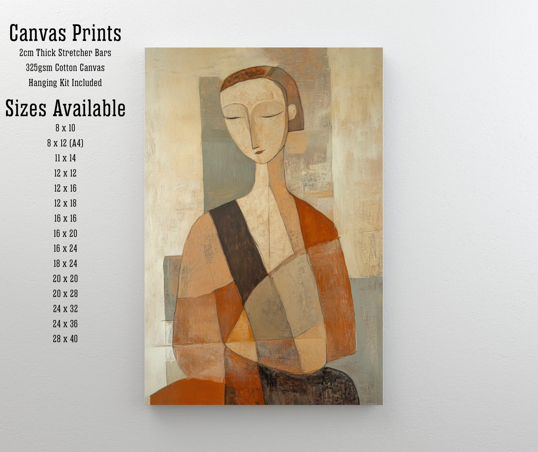 A refined abstract art print depicting a seated woman in a calm, contemplative pose. The artwork blends geometric forms with soft painterly texture in warm earth tones of ochre, terracotta, and grey. Perfect for adding sophistication and balance to modern interiors or minimalist living spaces. Part of the Heritage Canvas Collection celebrating timeless figurative expression.