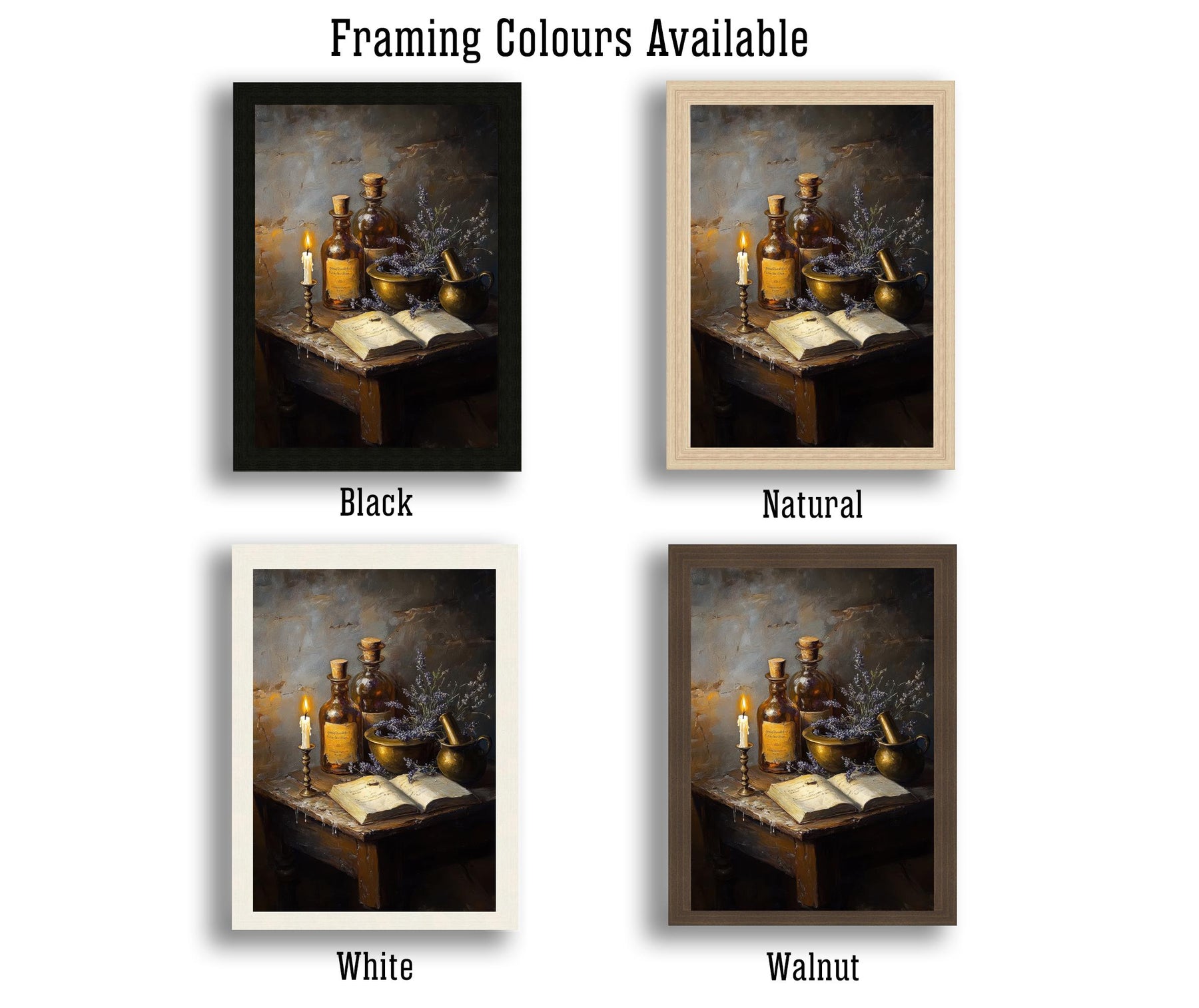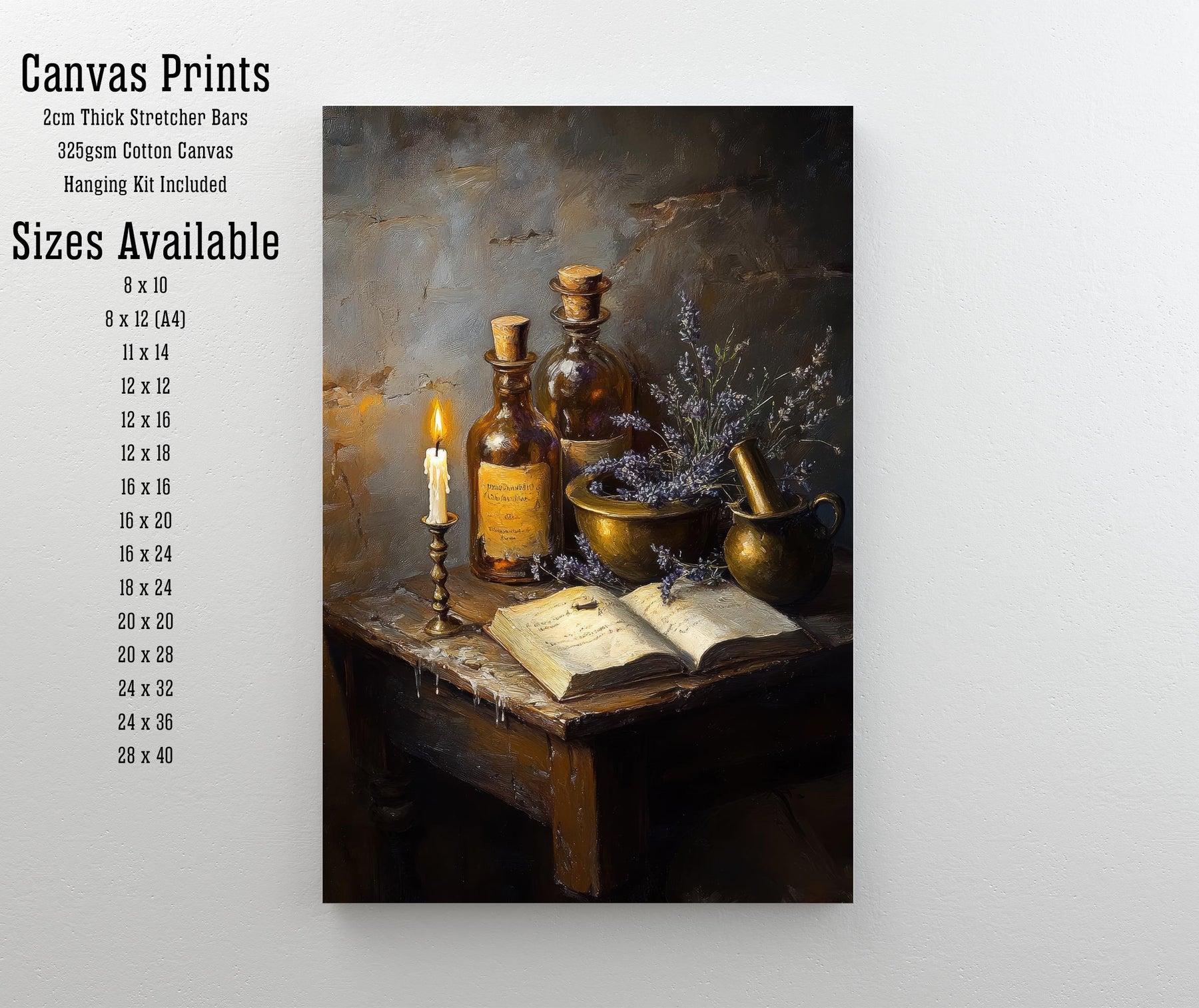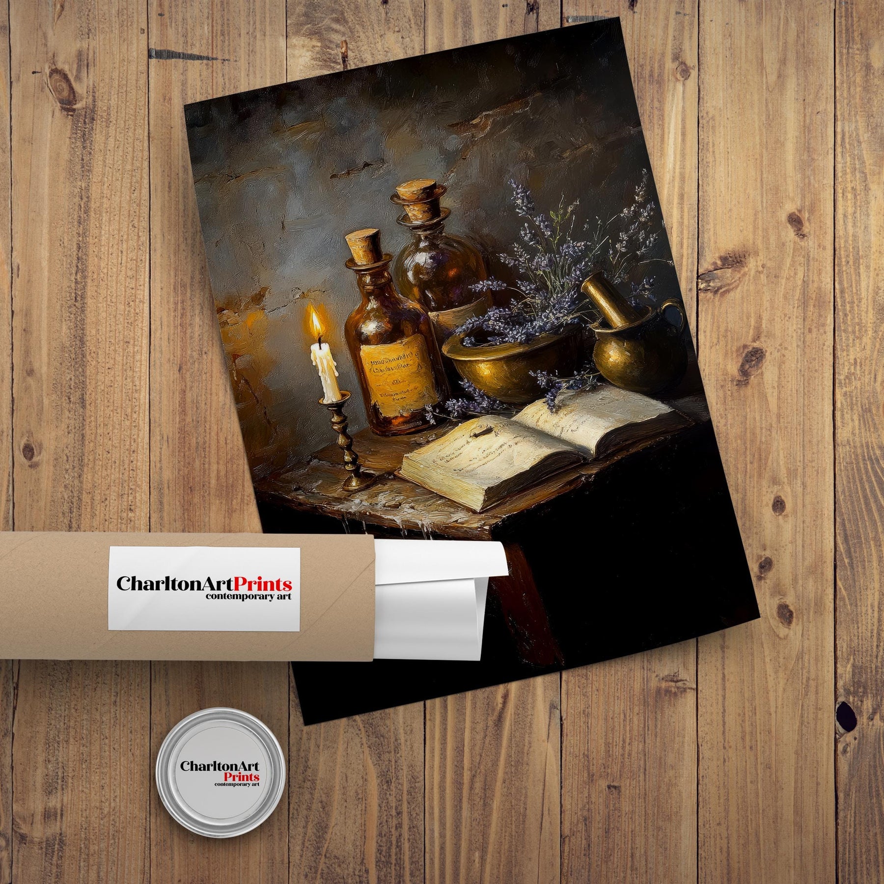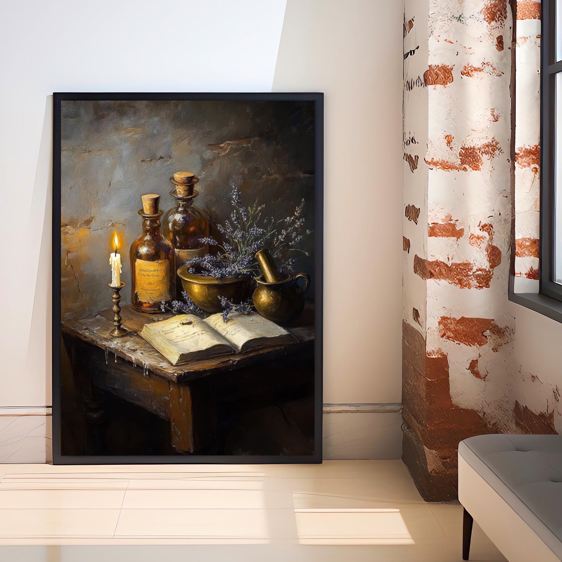 Immerse your space in scholarly charm with our Wooden Apothecary Table Art Print, a moody still life that blends the mystery of dark academia with the warmth of cottagecore design. This detailed artwork features a weathered wooden table adorned with glass bottles, dried herbs, candles, and handwritten notes, evoking the atmosphere of an old-world apothecary or hidden study. Perfect for book lovers and dreamers, it adds depth, history, and character to any reading nook or vintage-inspired interior. Printed on premium eco-friendly paper for timeless appeal.