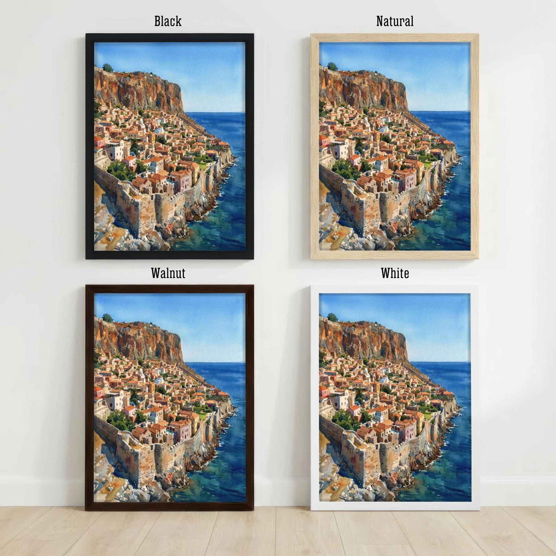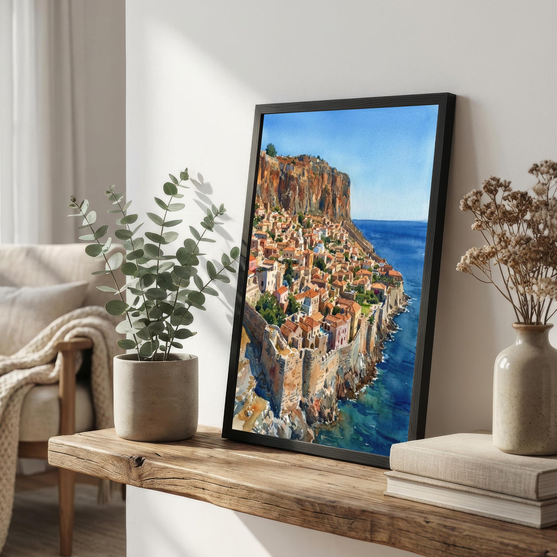 Monemvasia Watercolour Painting Poster Greece Wall Art Coastal Landscape Print Gift for Europe Travel Lovers and Fans of Scenic Historic