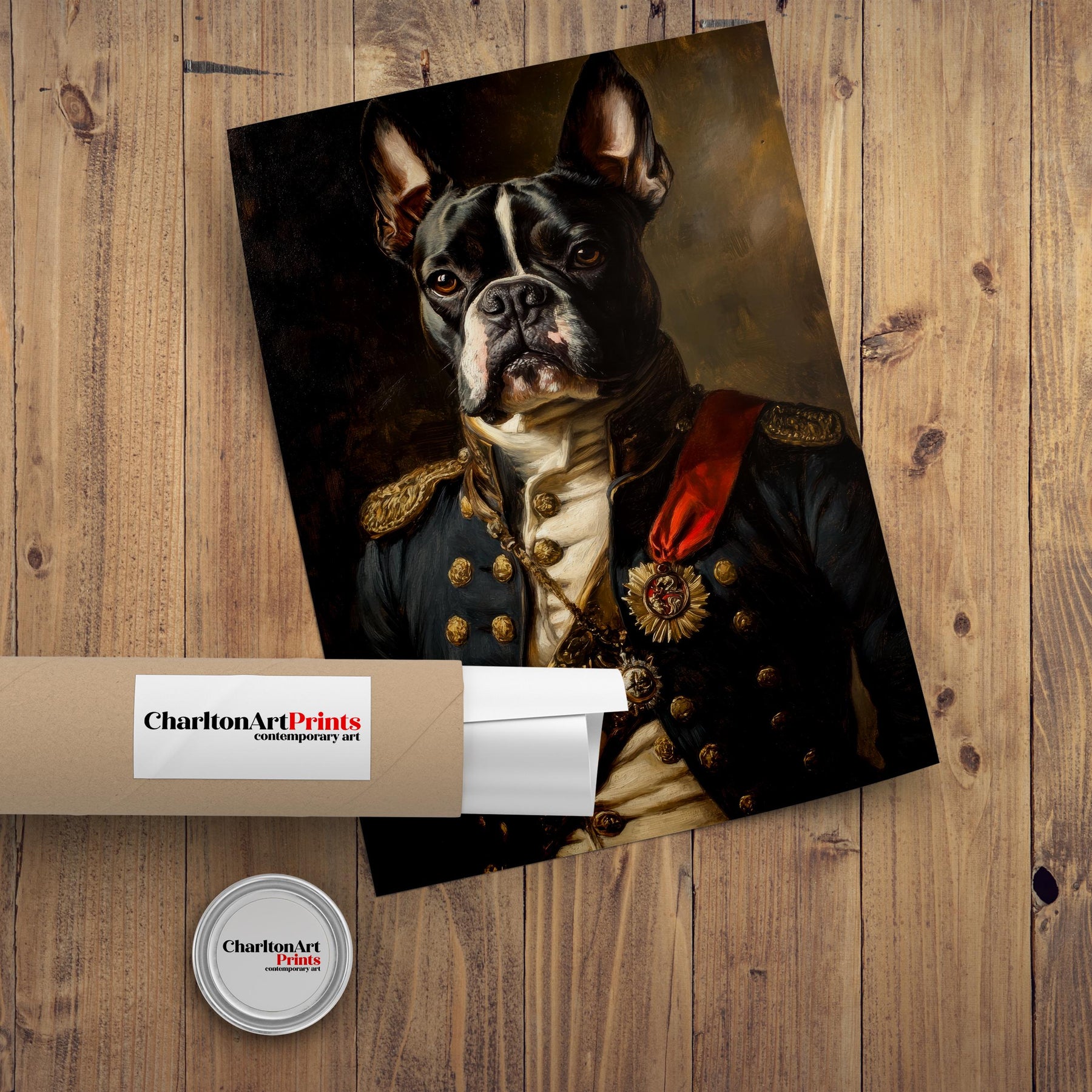 Add a touch of regal charm and whimsical humor to your space with our Boston Terrier Portrait Poster. This captivating artwork features a Boston Terrier dressed in a classic, historical military uniform, complete with medals and a distinguished expression. The piece offers a delightful blend of vintage portraiture and modern pet art, perfect for adding character to a living room, study, or even a dog lover's special nook. Printed on high-quality, eco-friendly paper, this art is not only a conversation starter but also a sustainable choice.