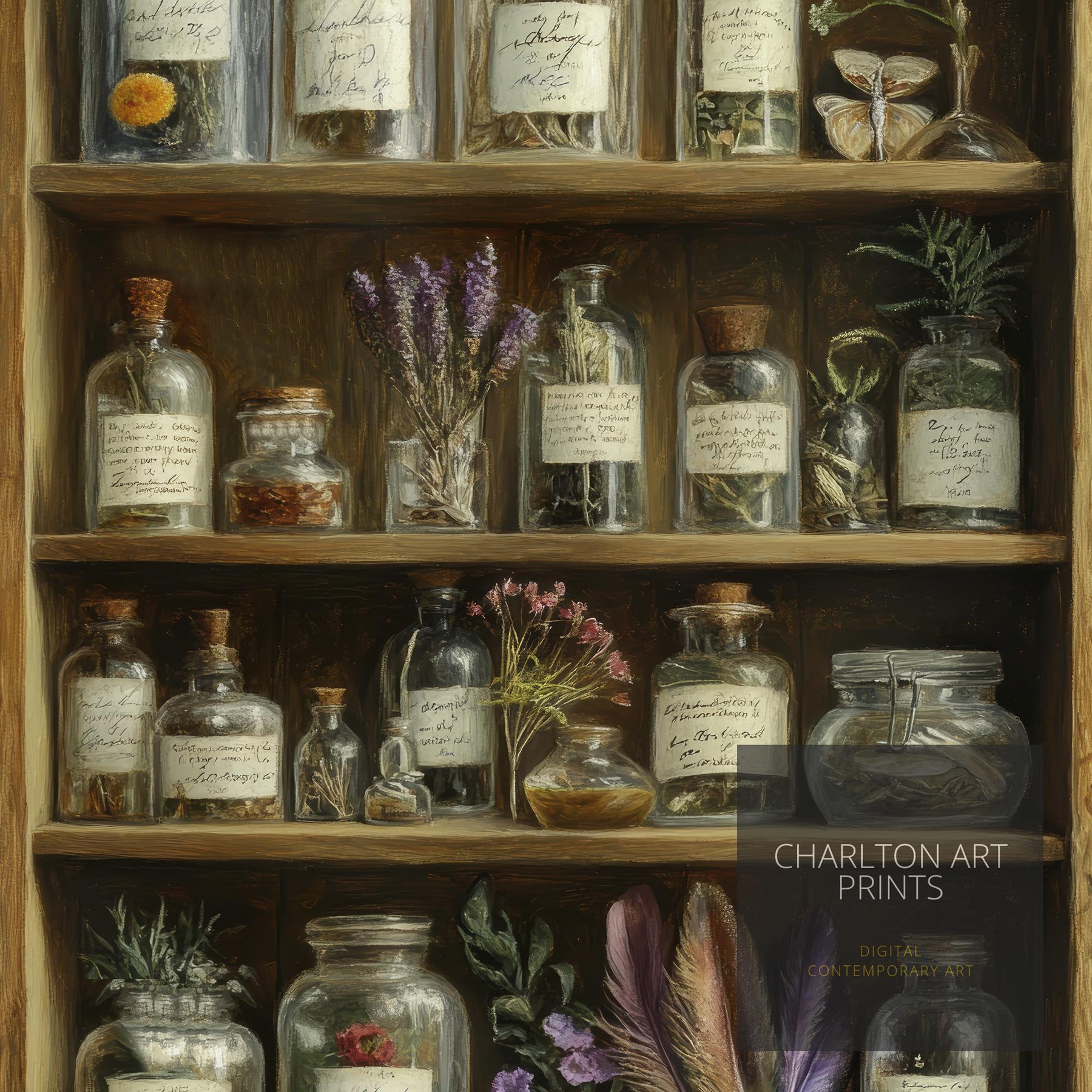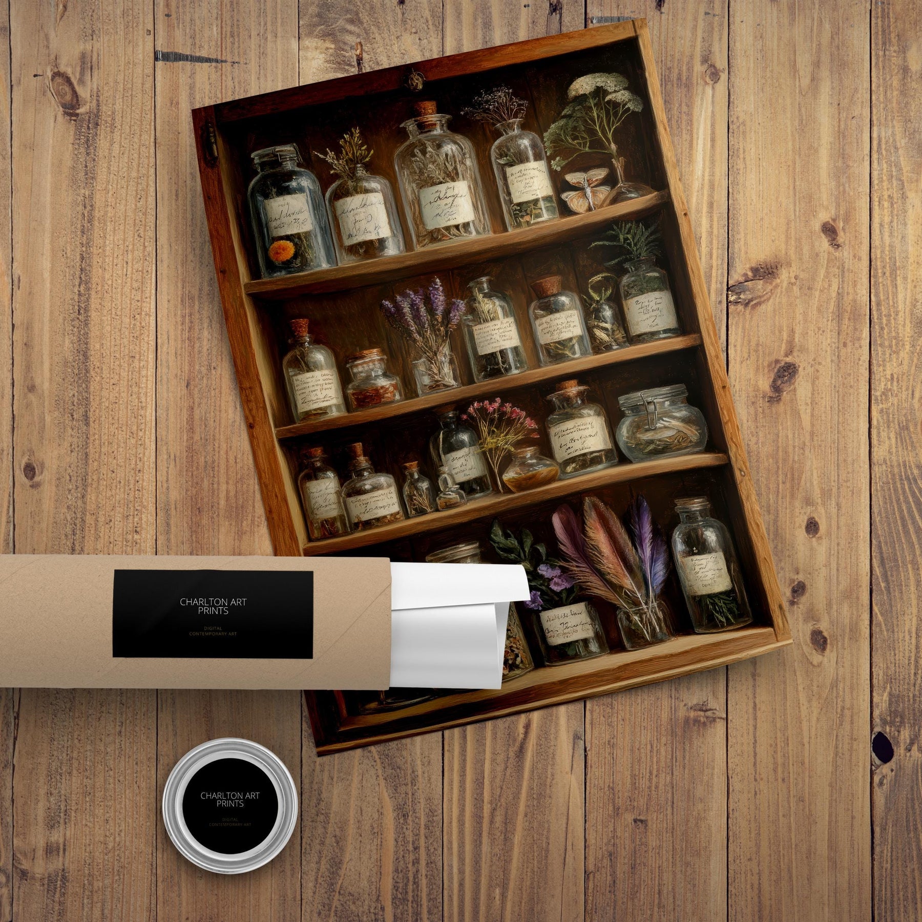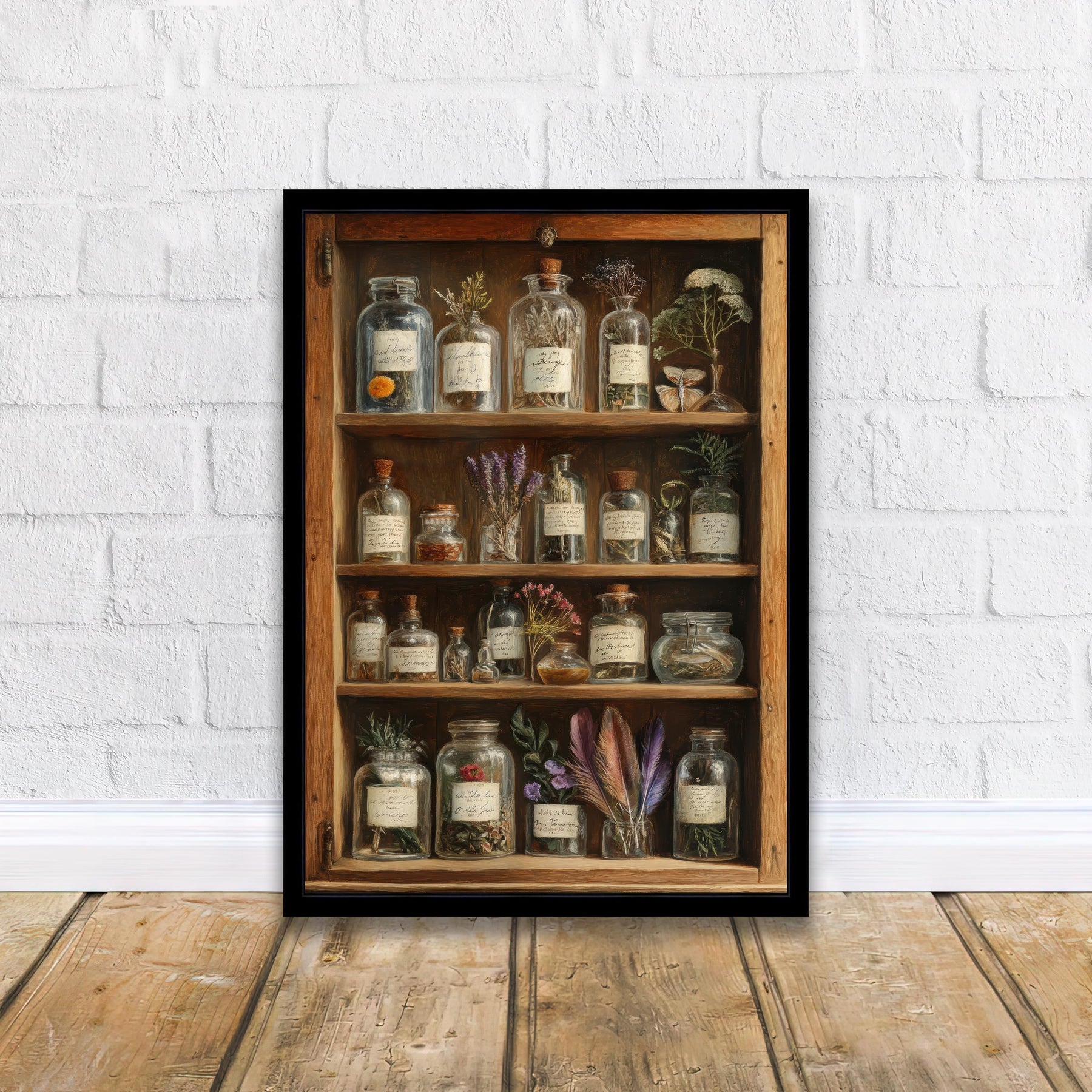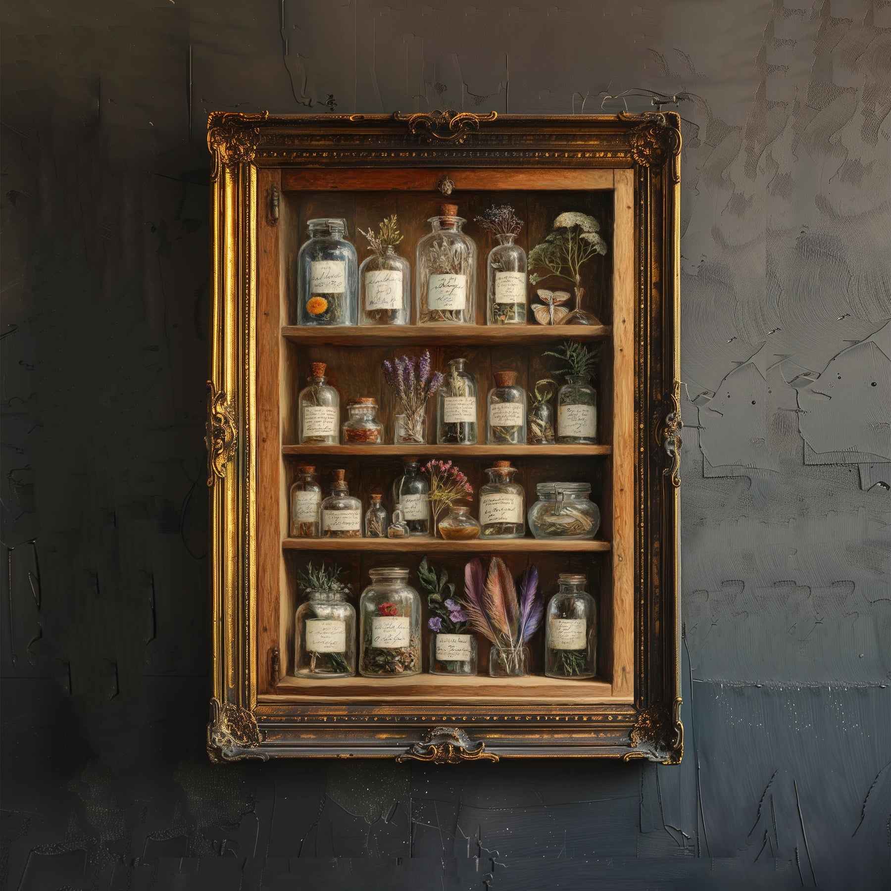 Step into a world of enchanting discoveries with this art print featuring a charming botanical cabinet of curiosities. This piece beautifully embodies the whimsical and natural essence of cottagecore, showcasing shelves filled with meticulously arranged dried flowers, preserved insects, curious seeds, and other delicate treasures from the natural world. Each compartment reveals a tiny wonder, inviting the viewer to explore the intricate details and hidden beauty of nature's bounty. Ideal for lovers of botany, vintage aesthetics, and those who appreciate the magic of collected wonders to bring a unique, cozy, and imaginative touch to their home.