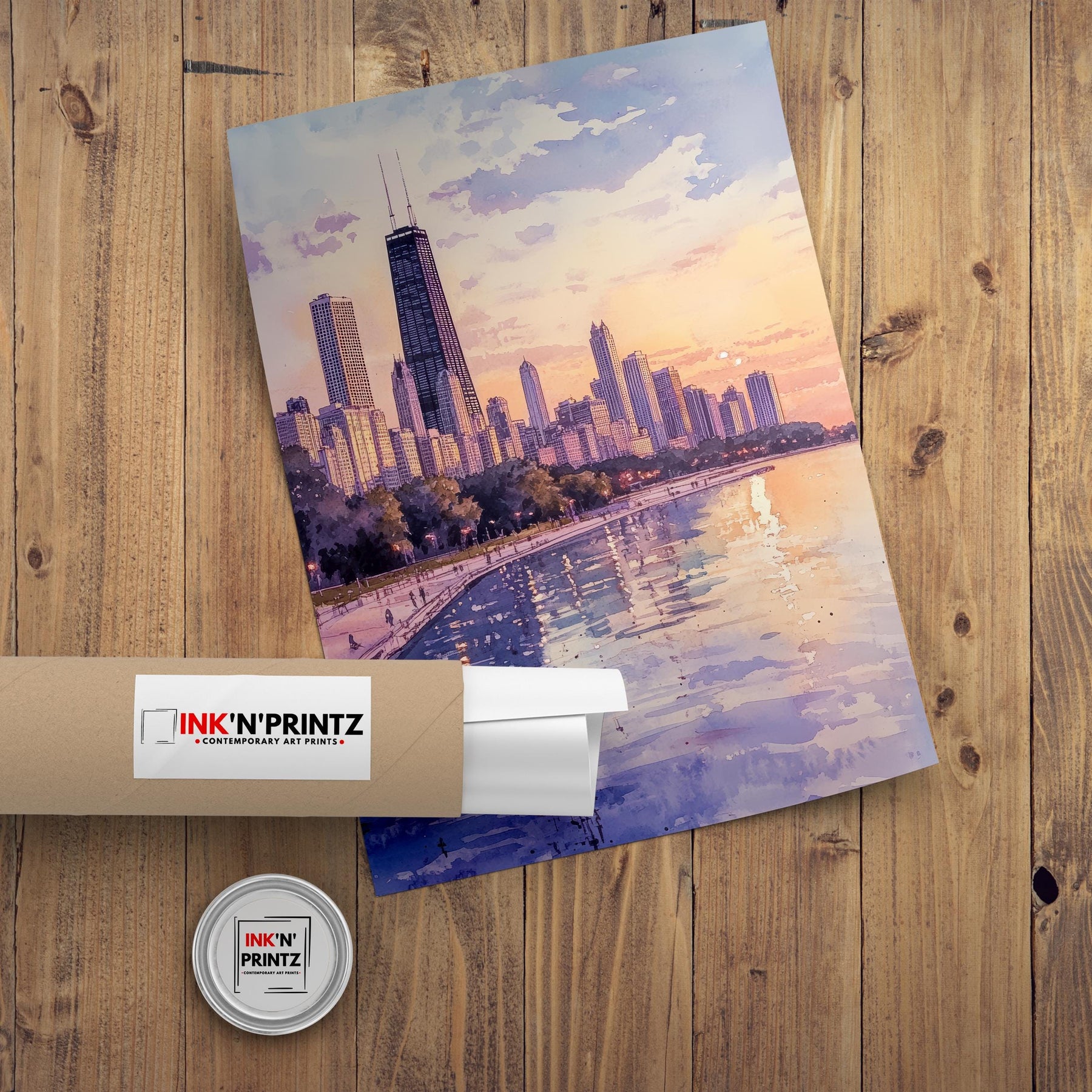 Capture the vibrant energy and iconic architecture of the "Windy City" with this stunning Chicago skyline watercolor art print. This painting beautifully portrays the distinctive silhouette of Chicago's downtown, featuring its world-renowned skyscrapers, the tranquil waters of Lake Michigan, and the bustling city life.