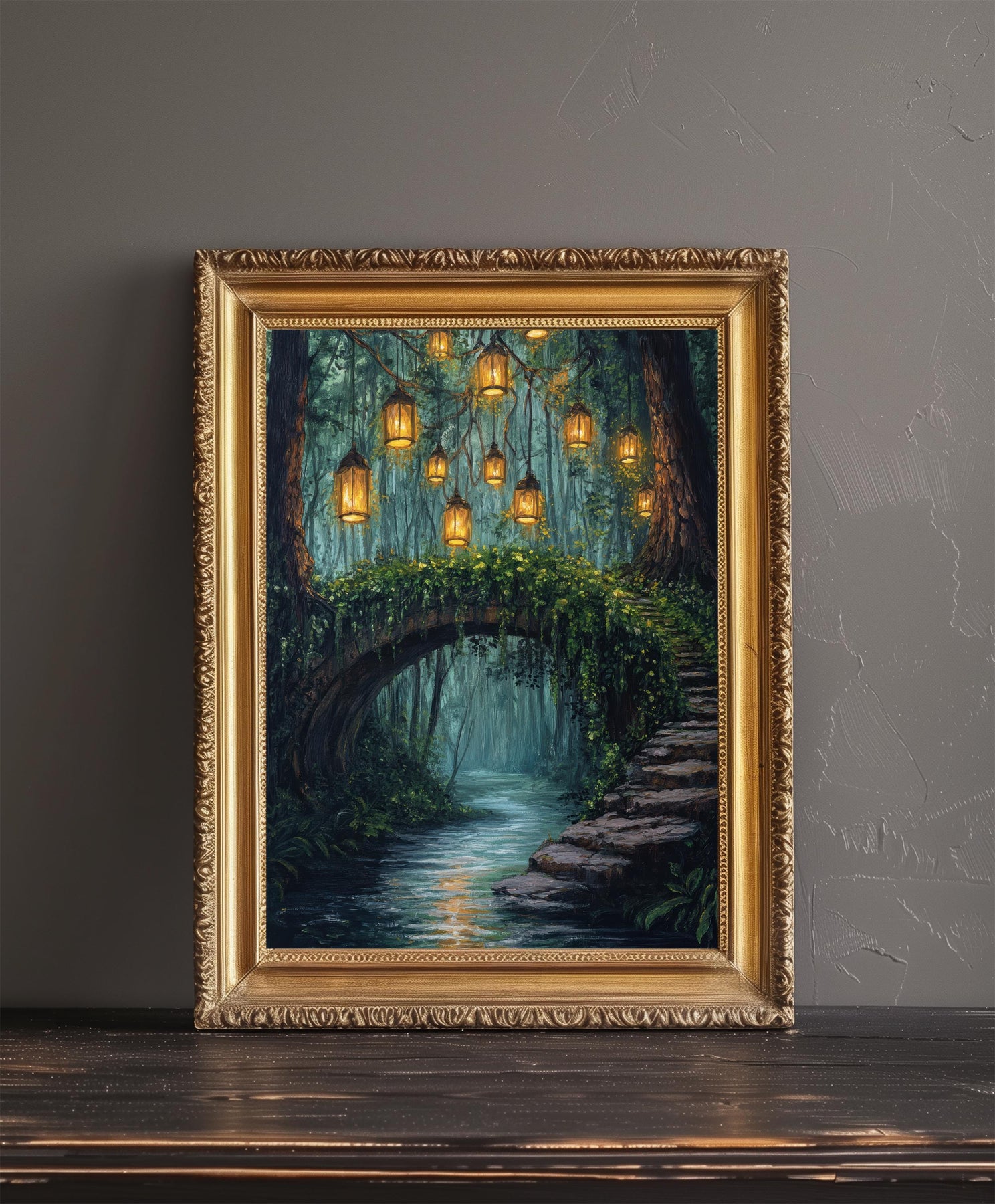 Enchanted Bridge with Lanterns Print Cottagecore Decor Dark Academia Art Magical Forest Illustration Vintage Wall Art