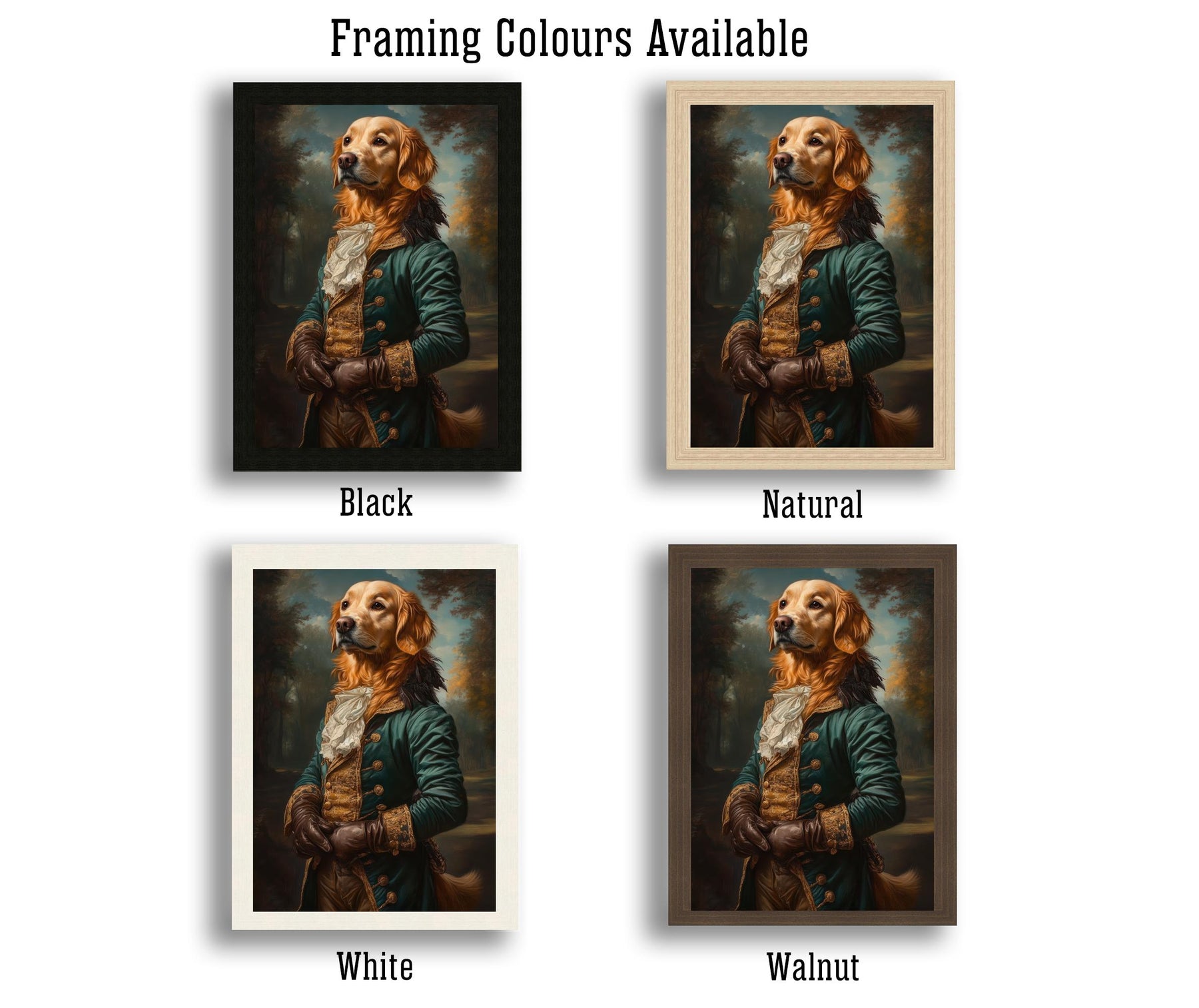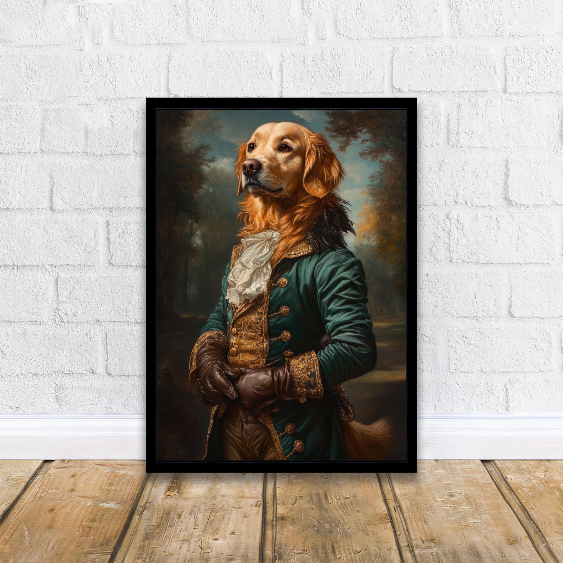 Add a touch of noble charm and whimsical humor to your space with our Golden Retriever Portrait Poster. This captivating artwork features a Golden Retriever dressed in a classic, historical noble's coat and ruffled shirt, with a serious and distinguished expression. The piece offers a delightful blend of vintage portraiture and modern pet art, perfect for adding a unique character to a living room, study, or any dog lover's special nook. Printed on high-quality, eco-friendly paper, this art is not only a great conversation starter but also a sustainable choice.