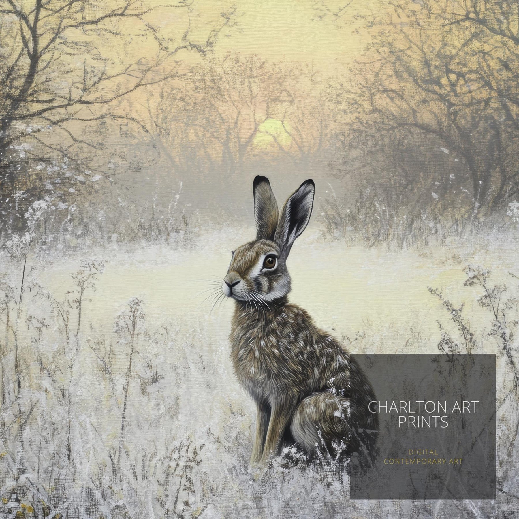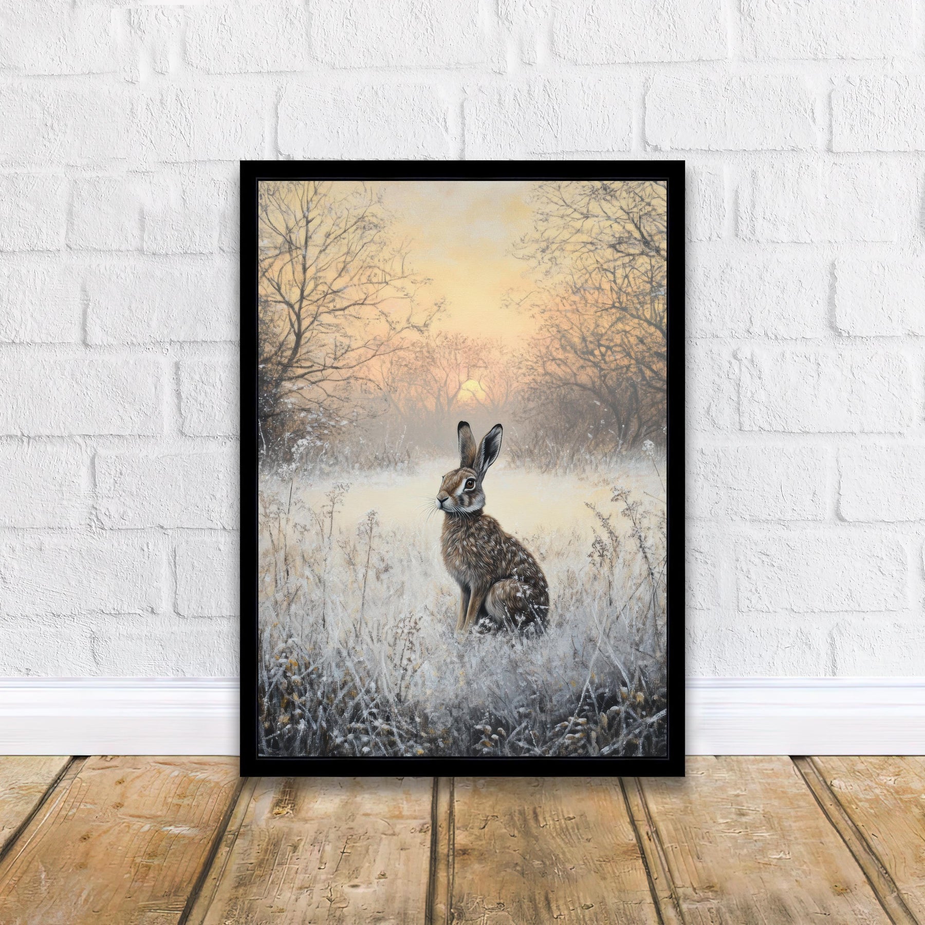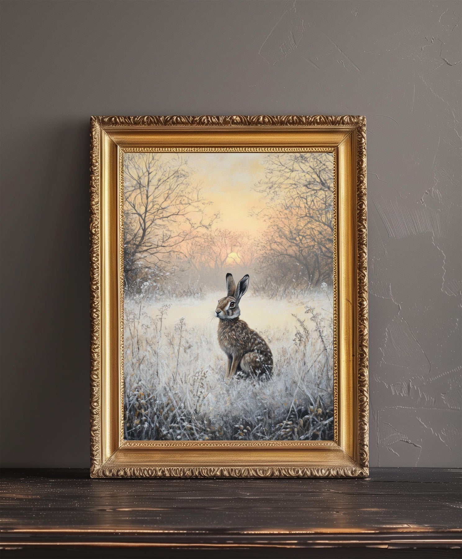 Hare in Frosty Meadow at Dawn Poster Cottagecore Decor Dark Academia Art Enchanted Winter Illustration Vintage Nature Wall Art