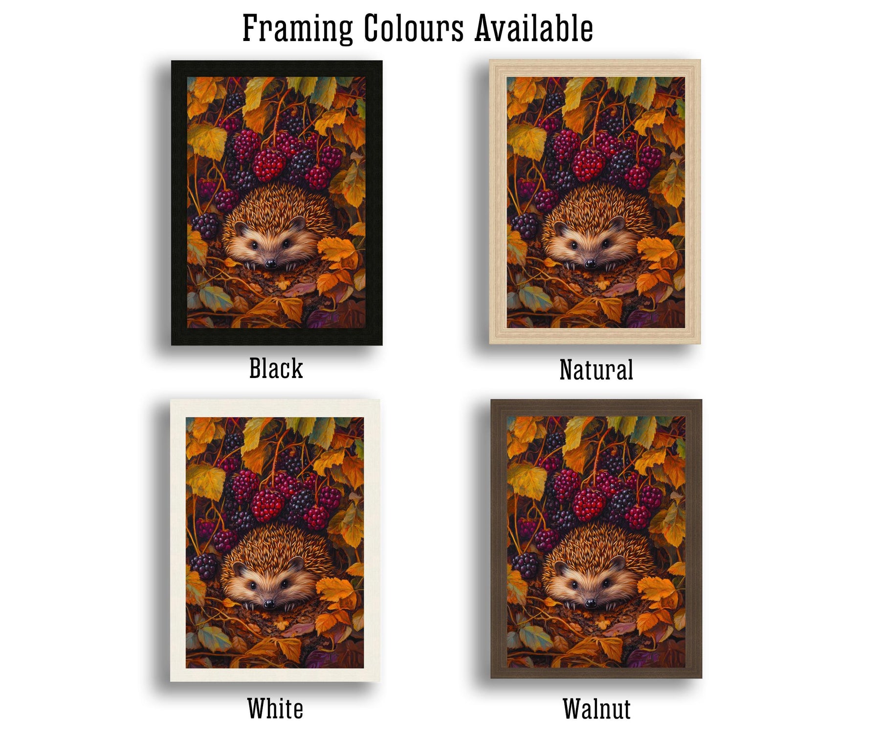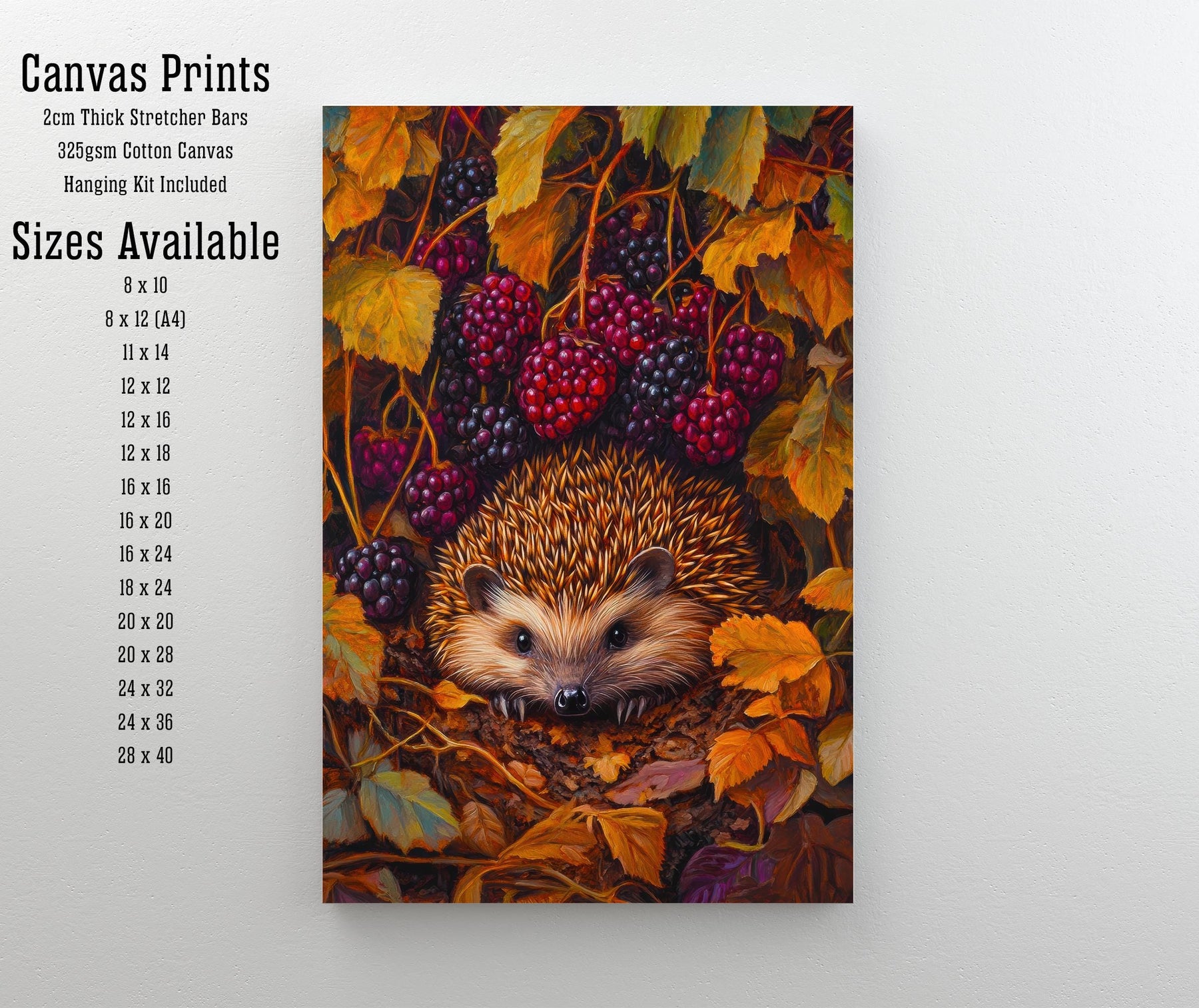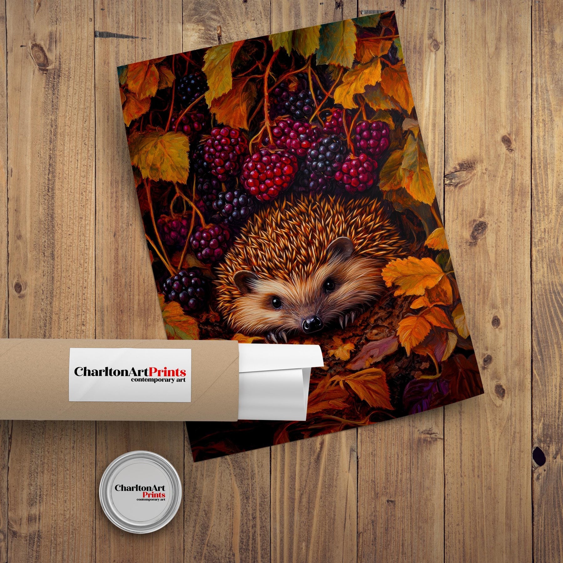 Delight in the quiet moments of nature with our Hedgehog Beneath Blackberry Bush Print. This endearing artwork captures a charming hedgehog peeking out from beneath a lush blackberry bush, its prickly form softened by the surrounding foliage and ripe berries. The scene perfectly embodies the rustic, cozy spirit of Cottagecore, evoking a sense of peaceful garden sanctuary and charming woodland life.