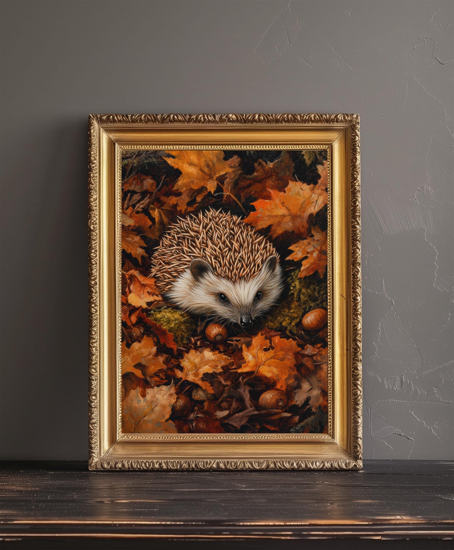 Delight in the charm of autumn with this adorable art print featuring a tiny hedgehog exploring a vibrant autumn forest. This piece perfectly captures the cozy and whimsical essence of cottagecore, showcasing the rich, warm hues of fall leaves and the endearing presence of woodland wildlife. It's an ideal addition for nature lovers, animal enthusiasts, or anyone wanting to infuse their space with the comforting beauty and quiet magic of an autumnal woodland scene.