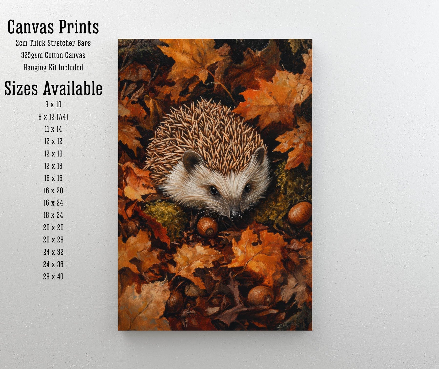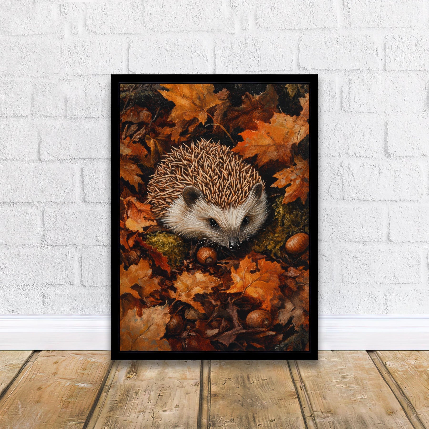 Delight in the charm of autumn with this adorable art print featuring a tiny hedgehog exploring a vibrant autumn forest. This piece perfectly captures the cozy and whimsical essence of cottagecore, showcasing the rich, warm hues of fall leaves and the endearing presence of woodland wildlife. It's an ideal addition for nature lovers, animal enthusiasts, or anyone wanting to infuse their space with the comforting beauty and quiet magic of an autumnal woodland scene.