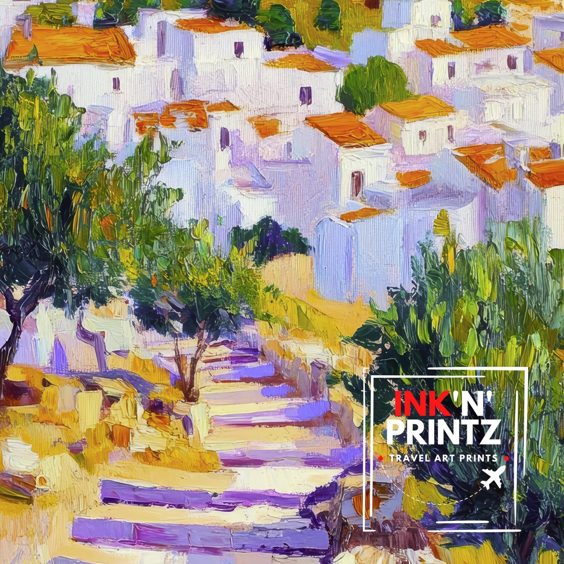 Lindos Rhodes Oil Painting Poster Greece Wall Art Coastal Village Landscape Poster Gift for Europe Travel Lovers and Fans of Scenic Greek