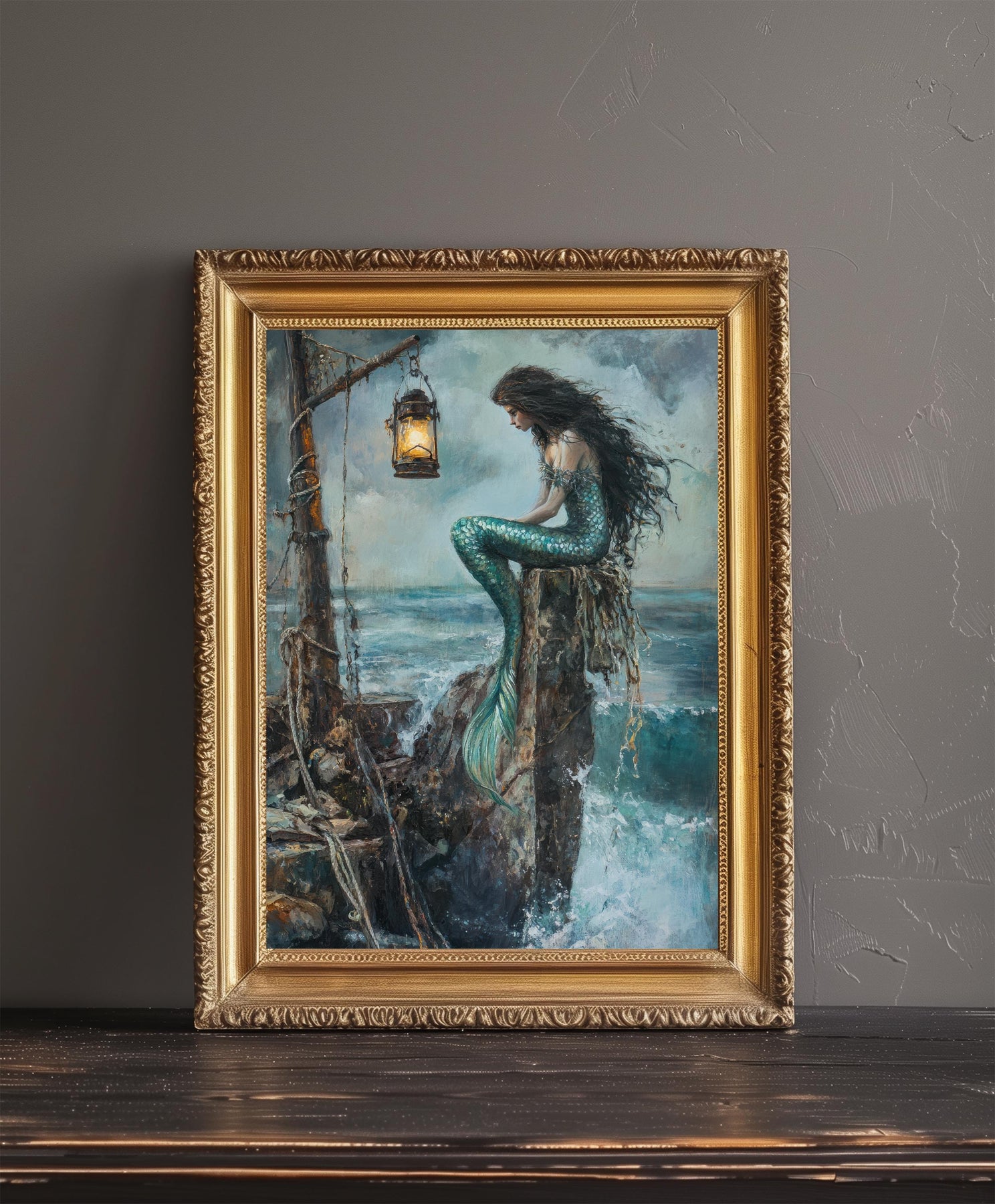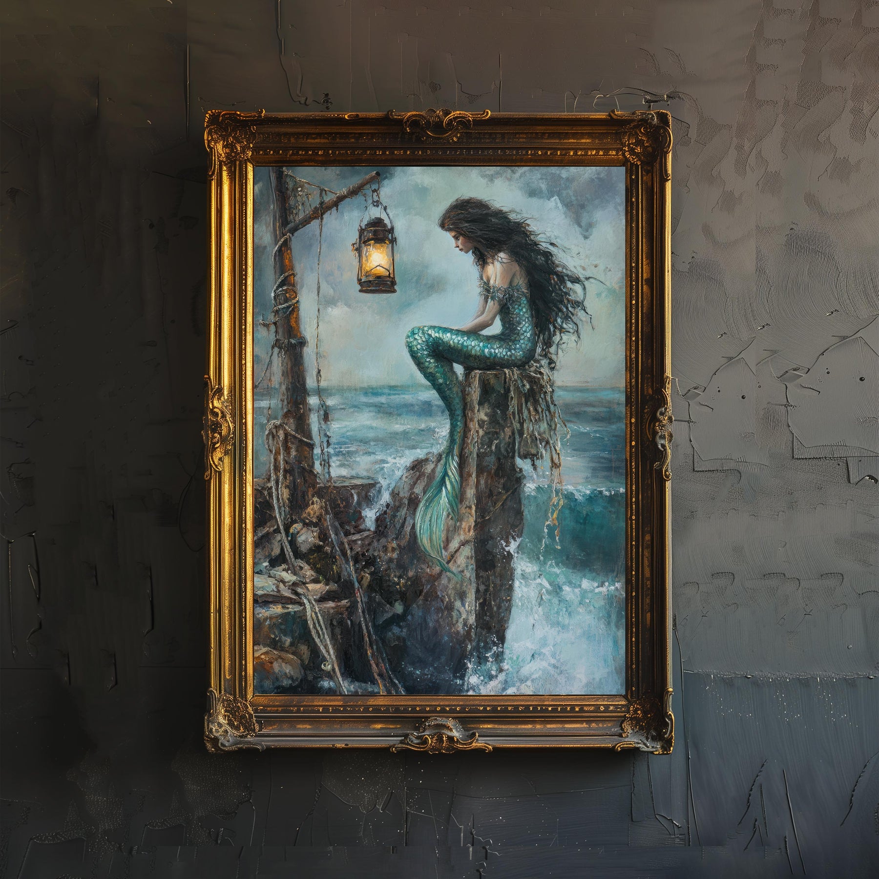 Step into a world of myth and mystery with our Siren on the Rocks Poster. This captivating artwork features a beautiful siren, perched on a barnacle-covered rock amid a stormy sea, with a lone lantern casting a haunting glow. Blending the allure of dark academia with a fantastical, mythical aesthetic, this print evokes a sense of both danger and beauty, of stories untold and adventures across the deep. Perfect for adding a touch of rustic magic and timeless charm to your study, living room, or cozy nook. Printed on high-quality, eco-friendly paper, this piece is both visually stunning and a sustainable choice.