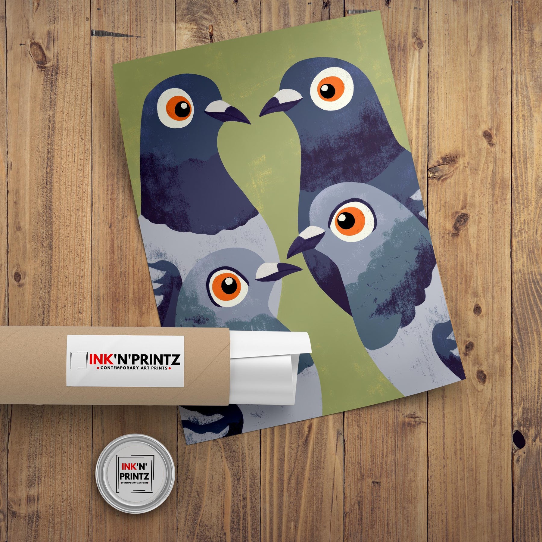 Add a playful vintage touch to your space with this bold Pigeons Art Print in retro midcentury pop style. Featuring four stylized pigeons with expressive eyes and painterly textures, this quirky wall poster pops with urban charm. A perfect conversation piece for kitchens, dining rooms, or modern interiors with a love for fun minimalist design and city birdlife.