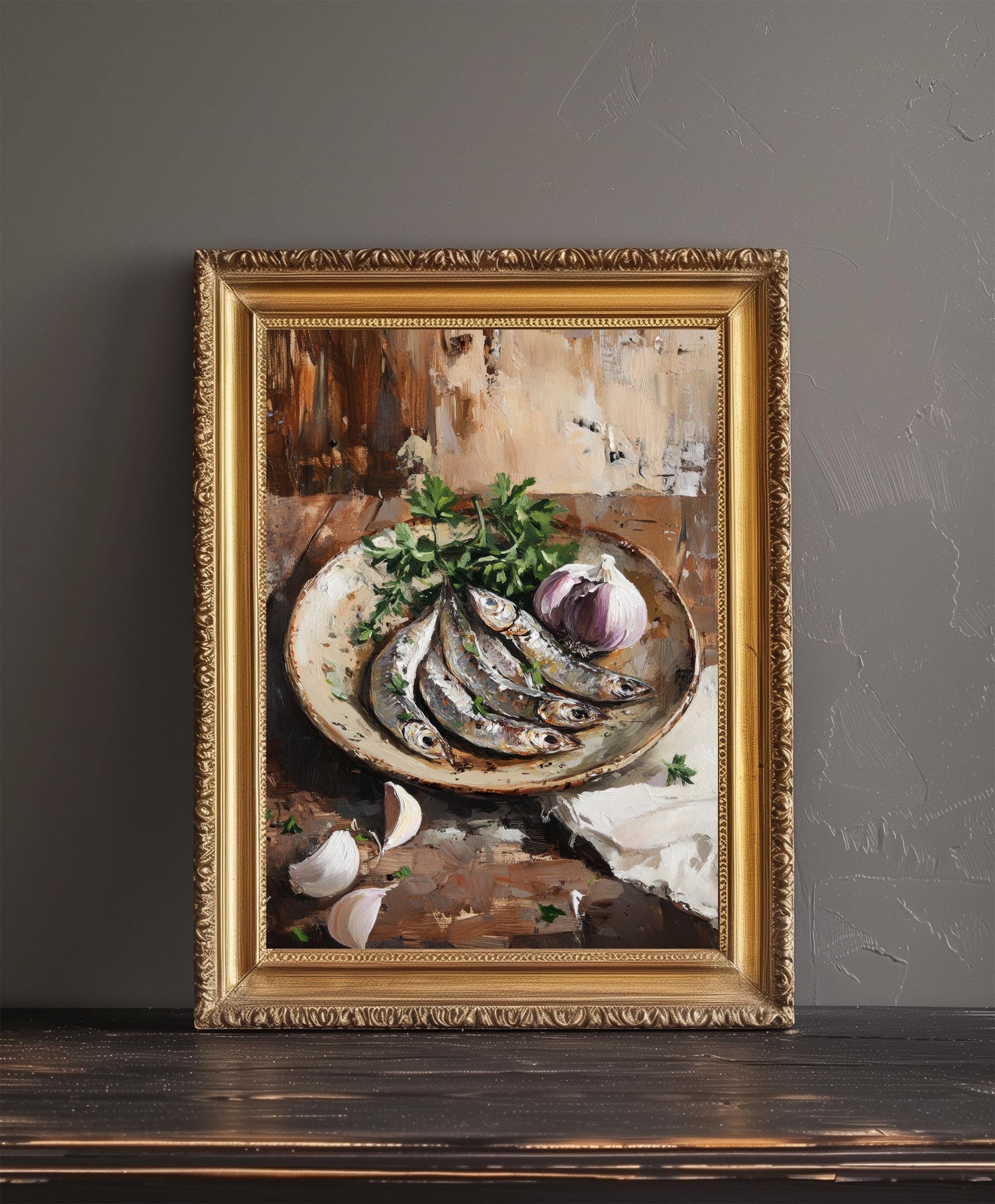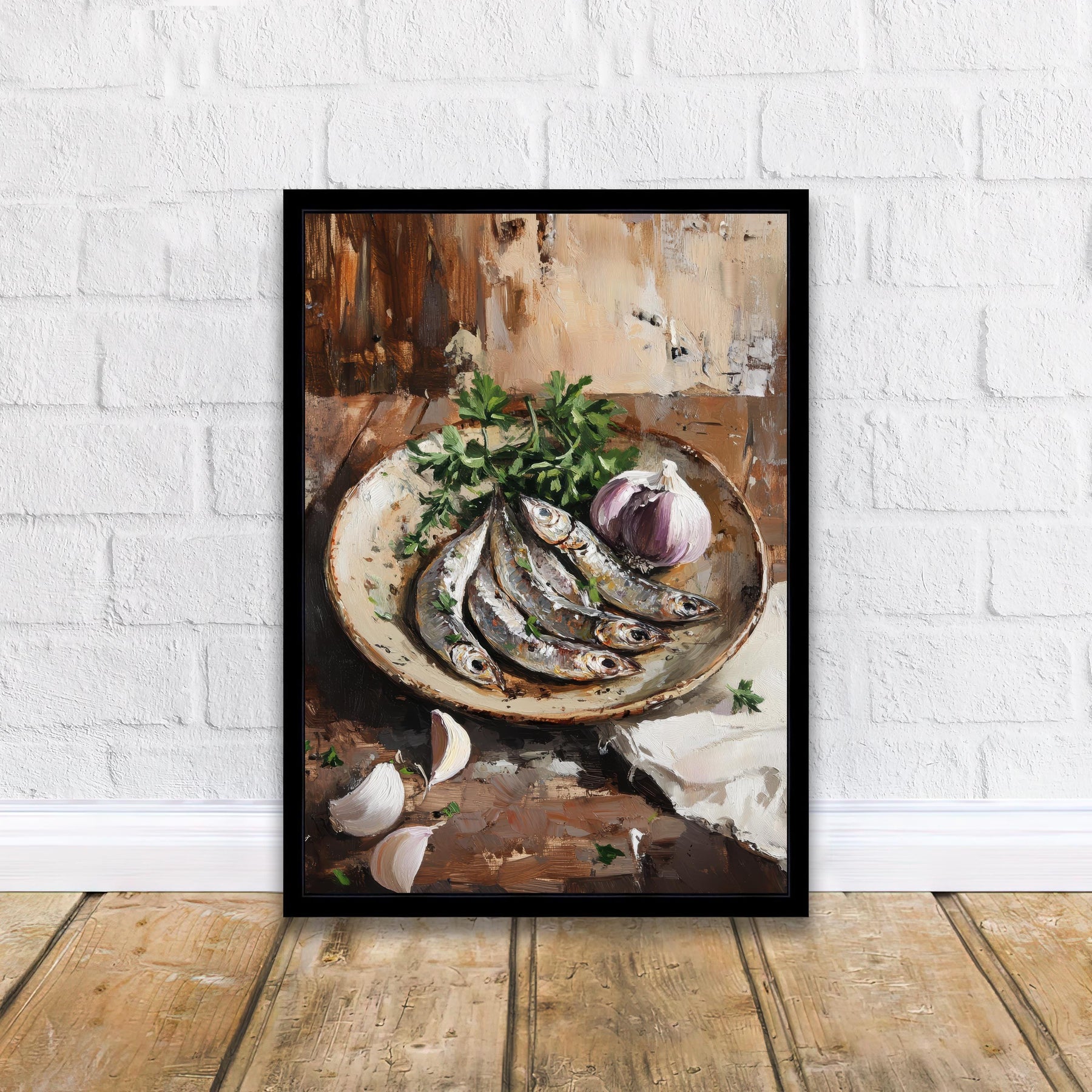 Add a touch of rustic, coastal charm to your home with our Plate of Sardines Poster. This beautiful artwork captures a still life scene with five fresh sardines on a plate, garnished with vibrant parsley and accompanied by a bulb of garlic and loose cloves. The textured, vintage-inspired style evokes the feel of a Mediterranean kitchen. Perfect for adding a rustic yet refined touch to your kitchen, dining room, or a seaside-themed space. Printed on high-quality, eco-friendly paper, this piece is both visually appealing and a sustainable choice.