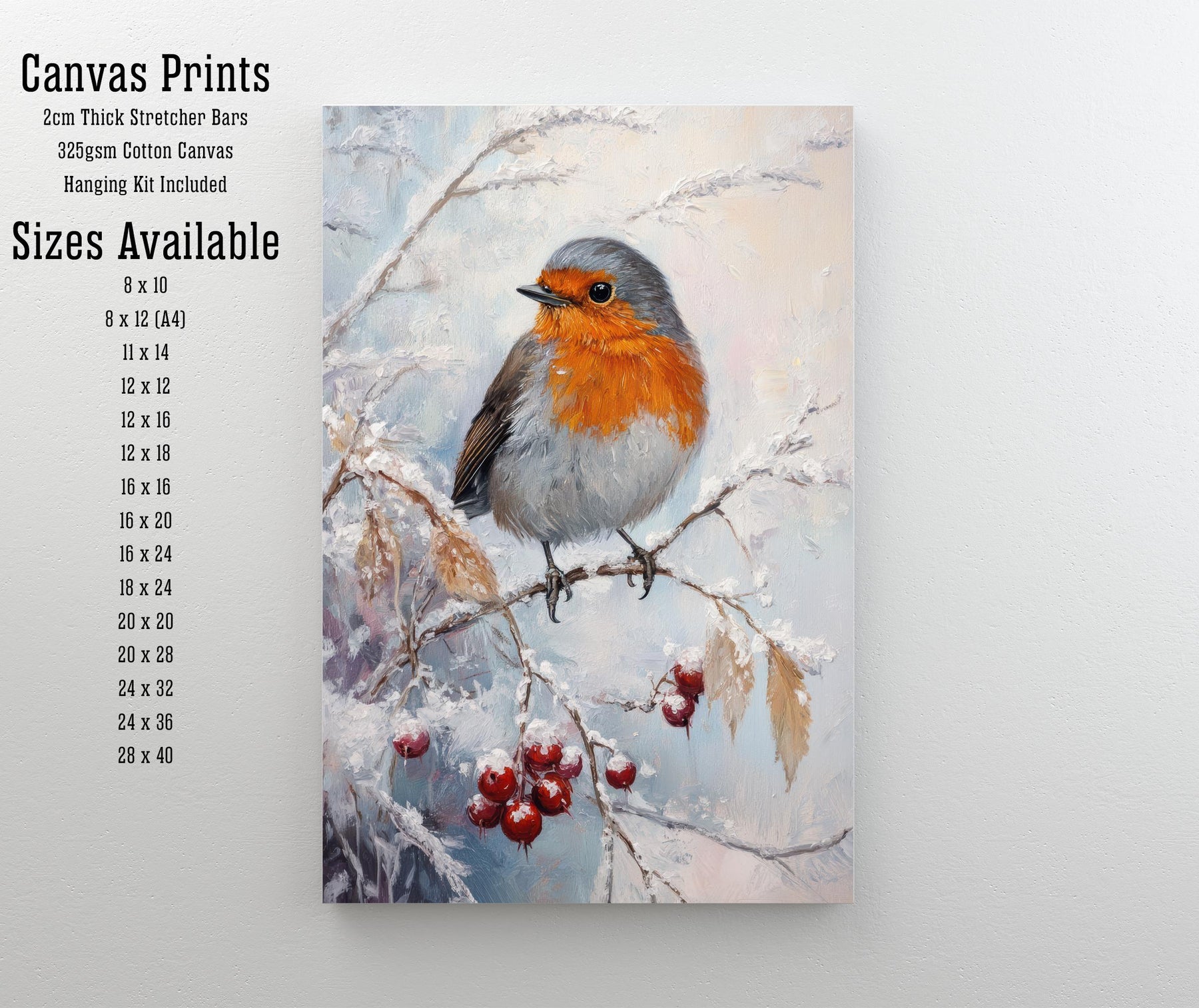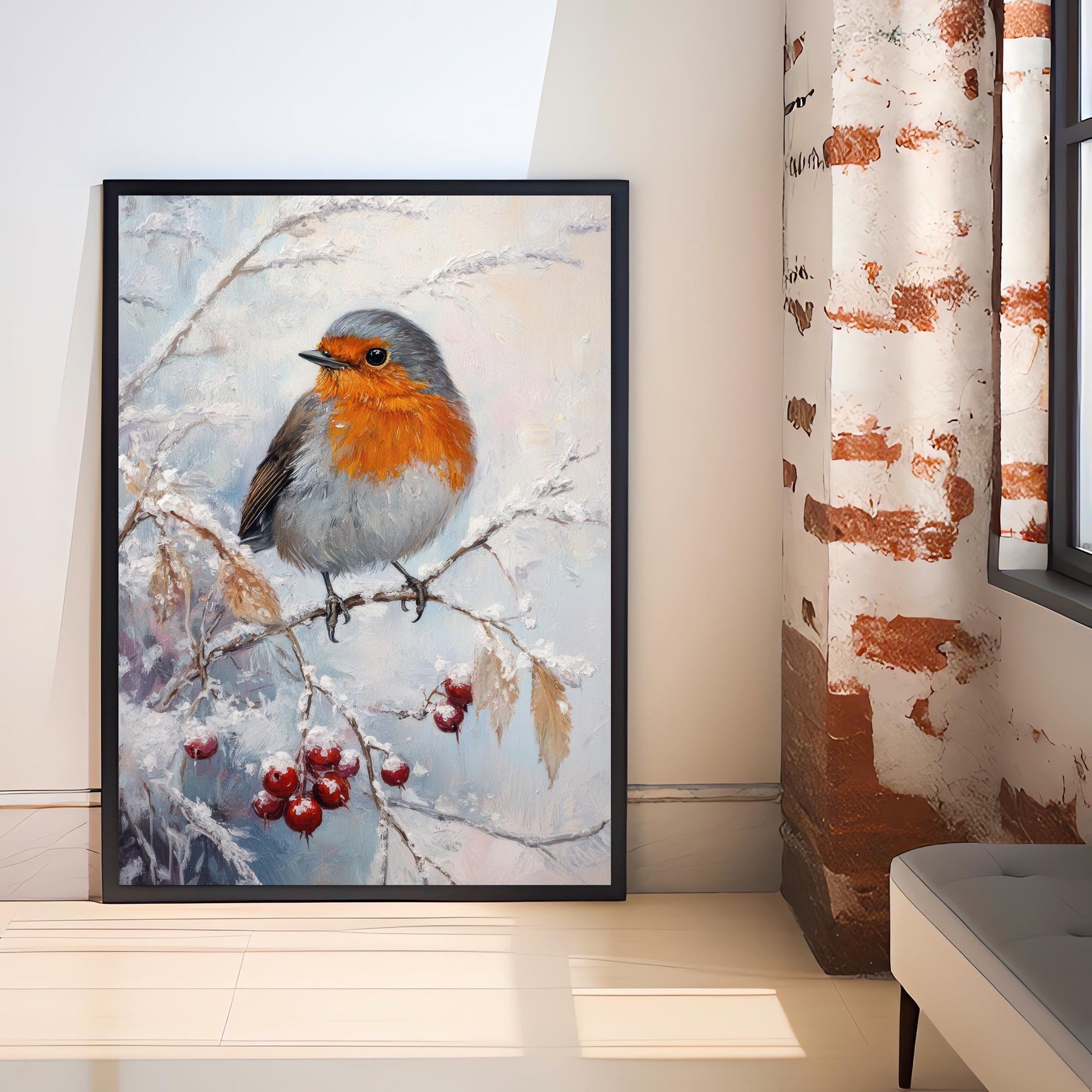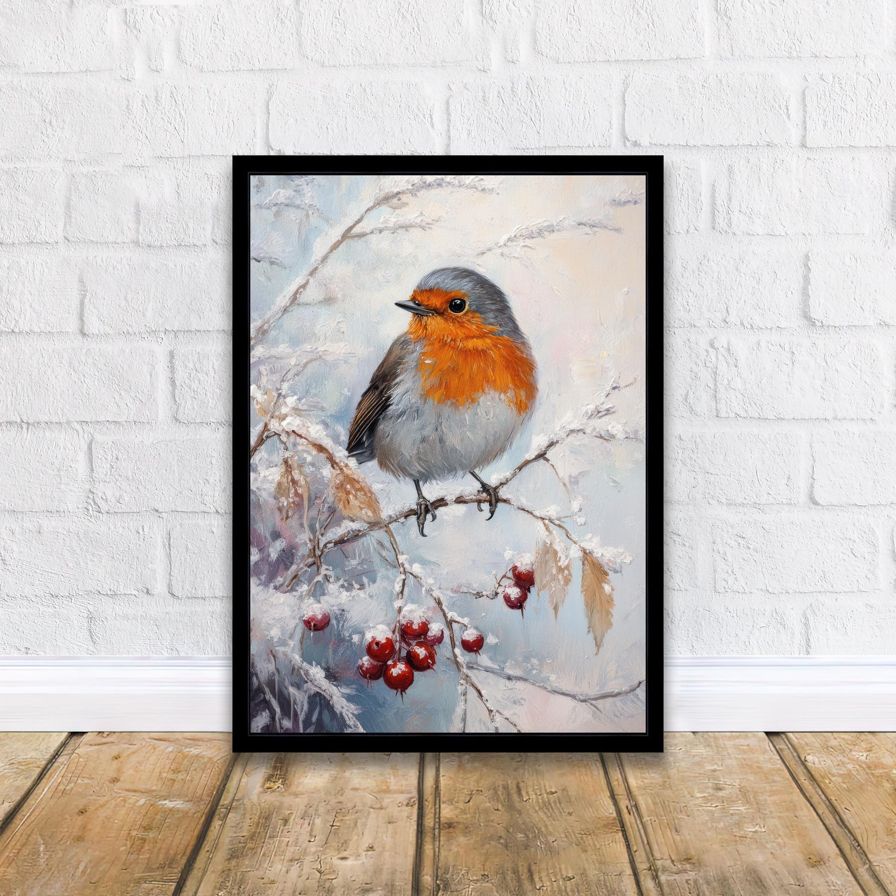 Capture the crisp beauty of winter with this enchanting art print featuring a vibrant red-breasted robin perched among thorny brambles dusted with delicate frost. This piece beautifully blends the rustic charm of cottagecore with the serene stillness of a frosty morning. The intricate details of the robin's feathers and the glistening ice on the brambles evoke a sense of quiet magic and resilience. It's an ideal addition for nature lovers, bird enthusiasts, or anyone seeking to bring the tranquil beauty of a winter woodland into their home.
