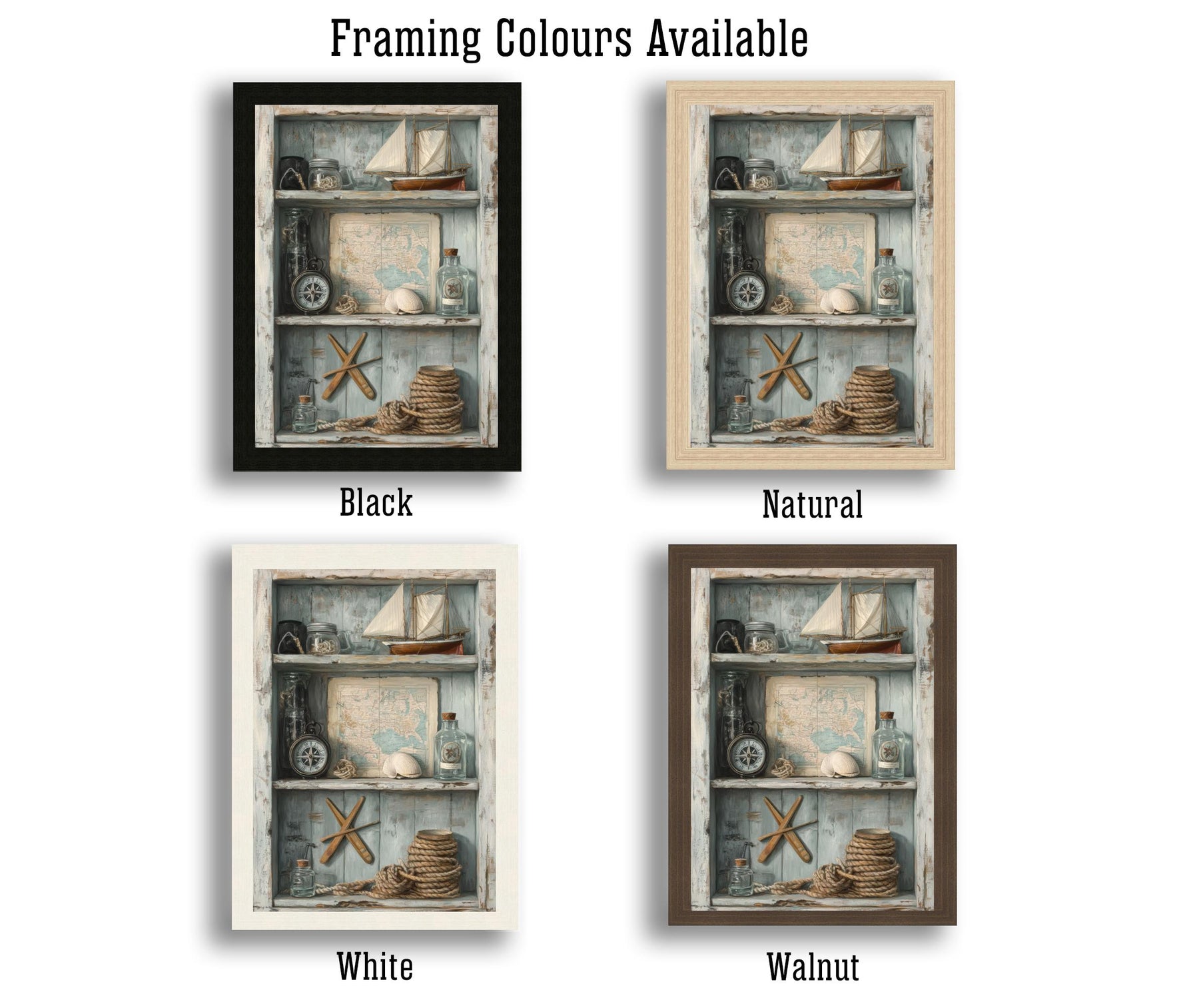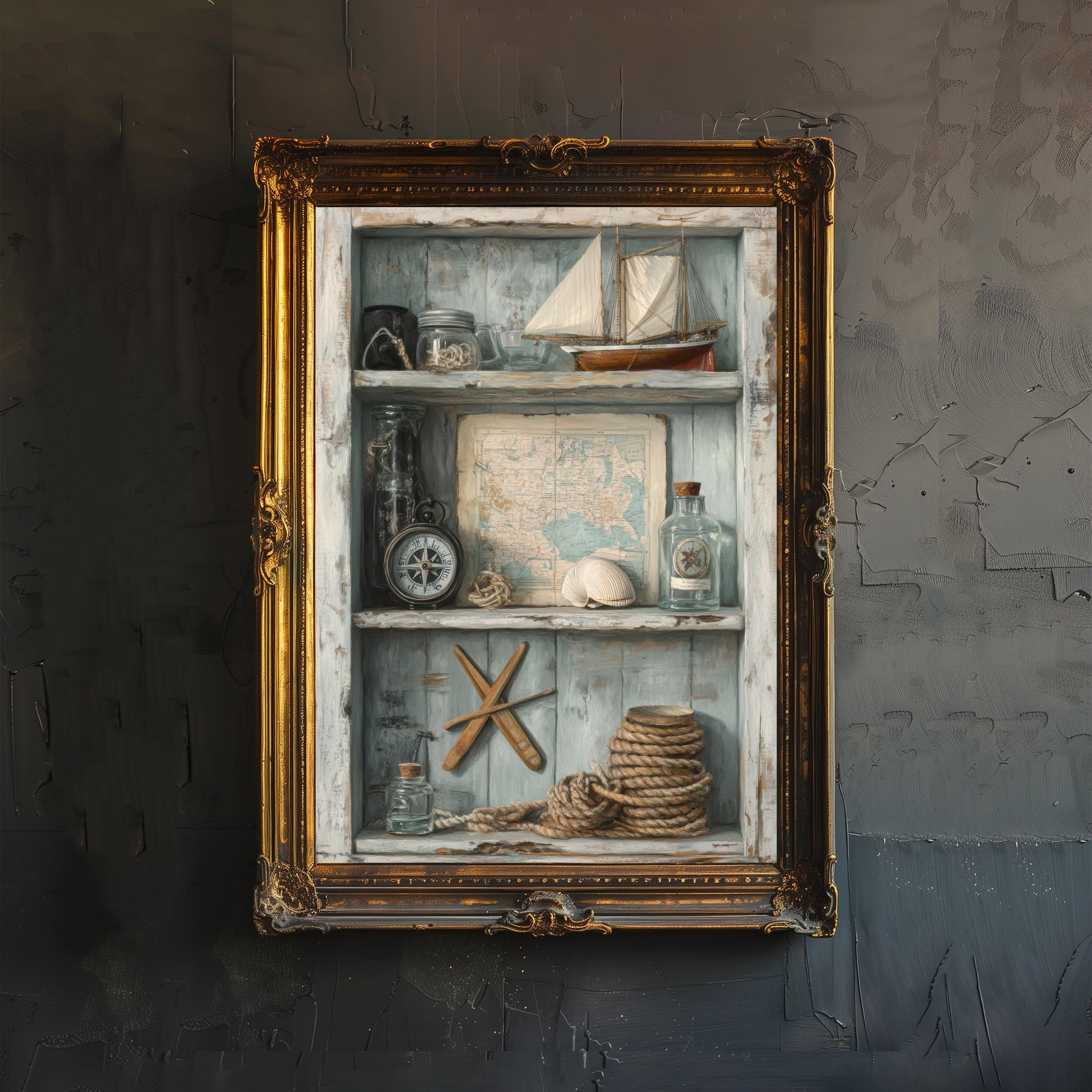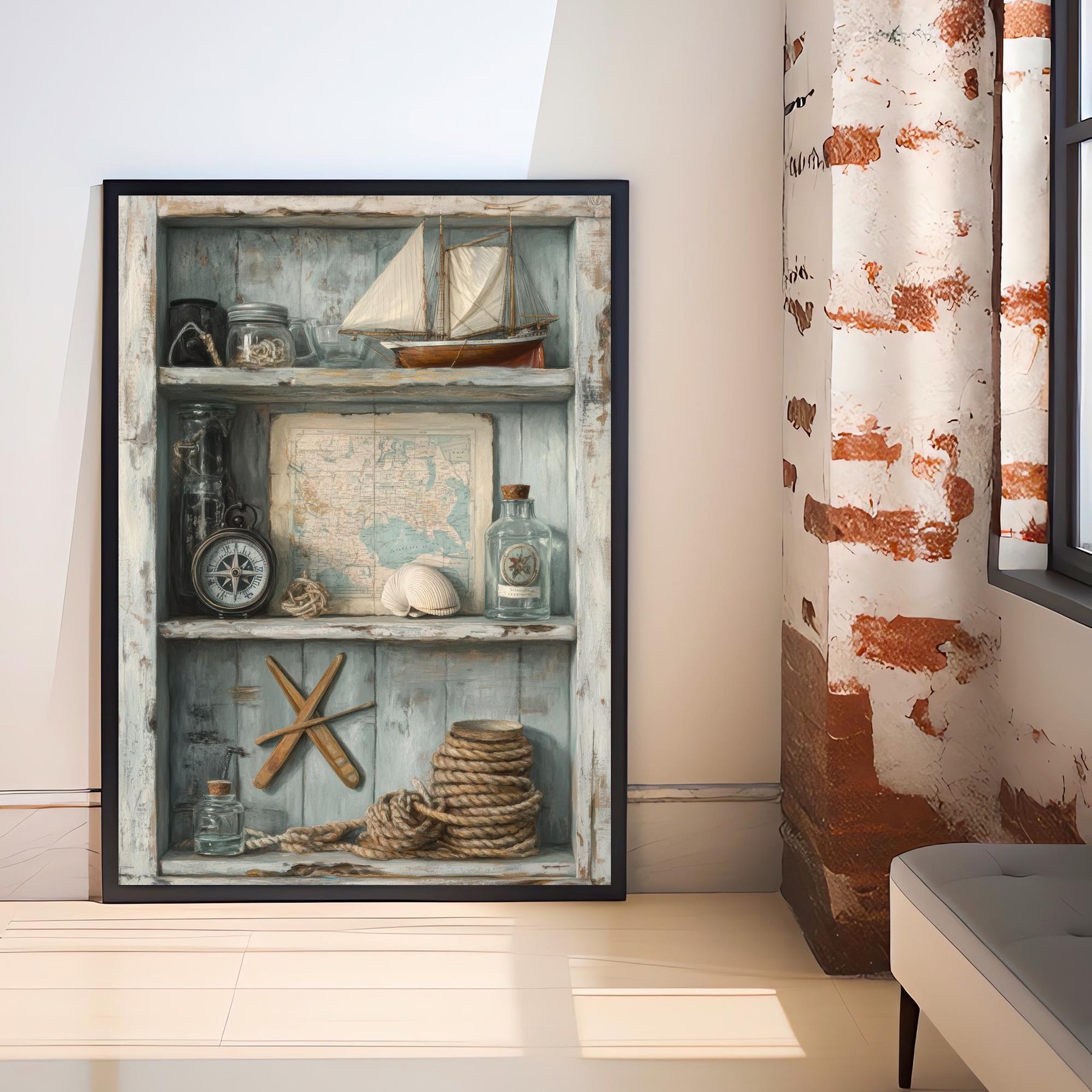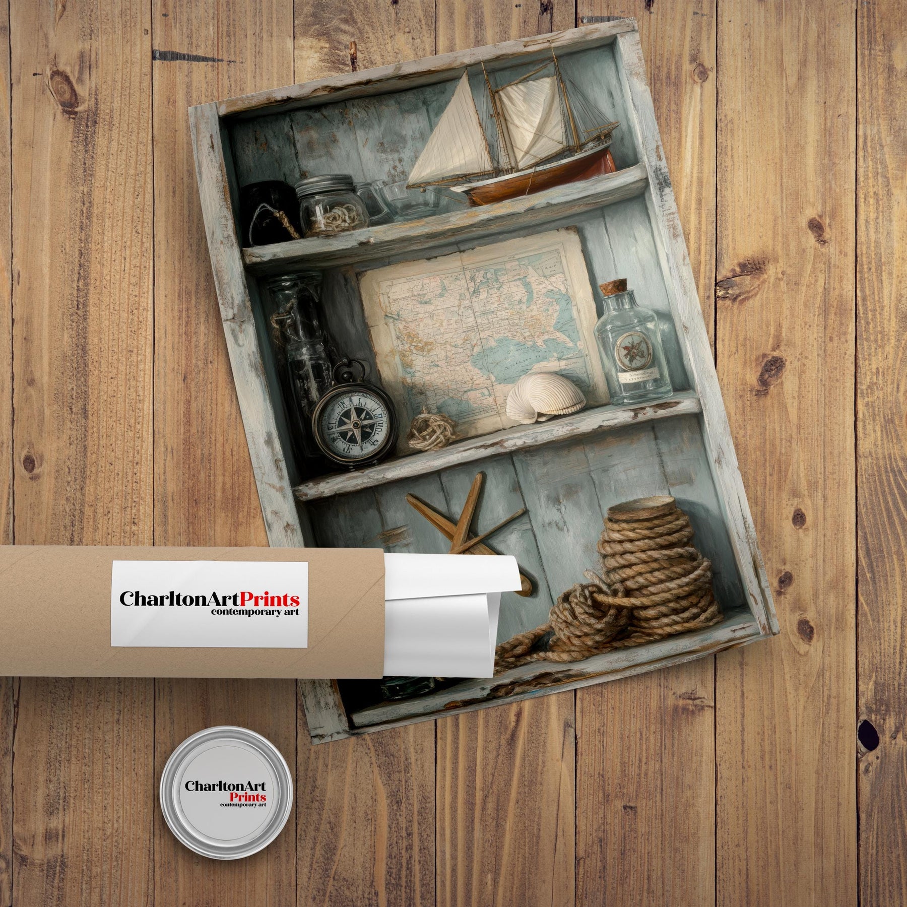 Bring the serene charm of the seaside into your home with our Rustic Coastal Still Life Poster. This captivating artwork captures a weathered bookshelf filled with treasures from the sea, including a vintage sailing ship model, a compass, old maps, and a coil of rope. The painting's textured, vintage-inspired style evokes the quiet stories of sea voyages and sun-bleached adventures. Perfect for adding a rustic, refined touch to your living room, study, or any space with a seaside theme. Printed on high-quality, eco-friendly paper, this piece is both visually appealing and a sustainable choice.