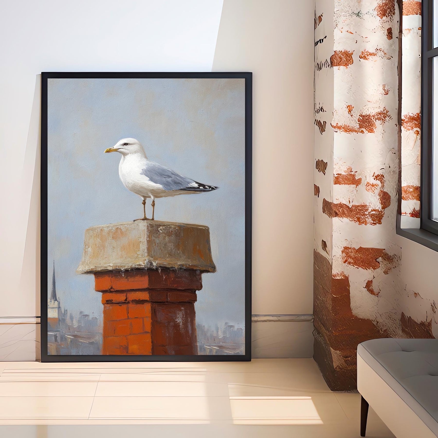 Seagull on Chimney Poster Coastal Wall Art Print Seaside Bird Illustration for Beach House or Nautical Home Decor