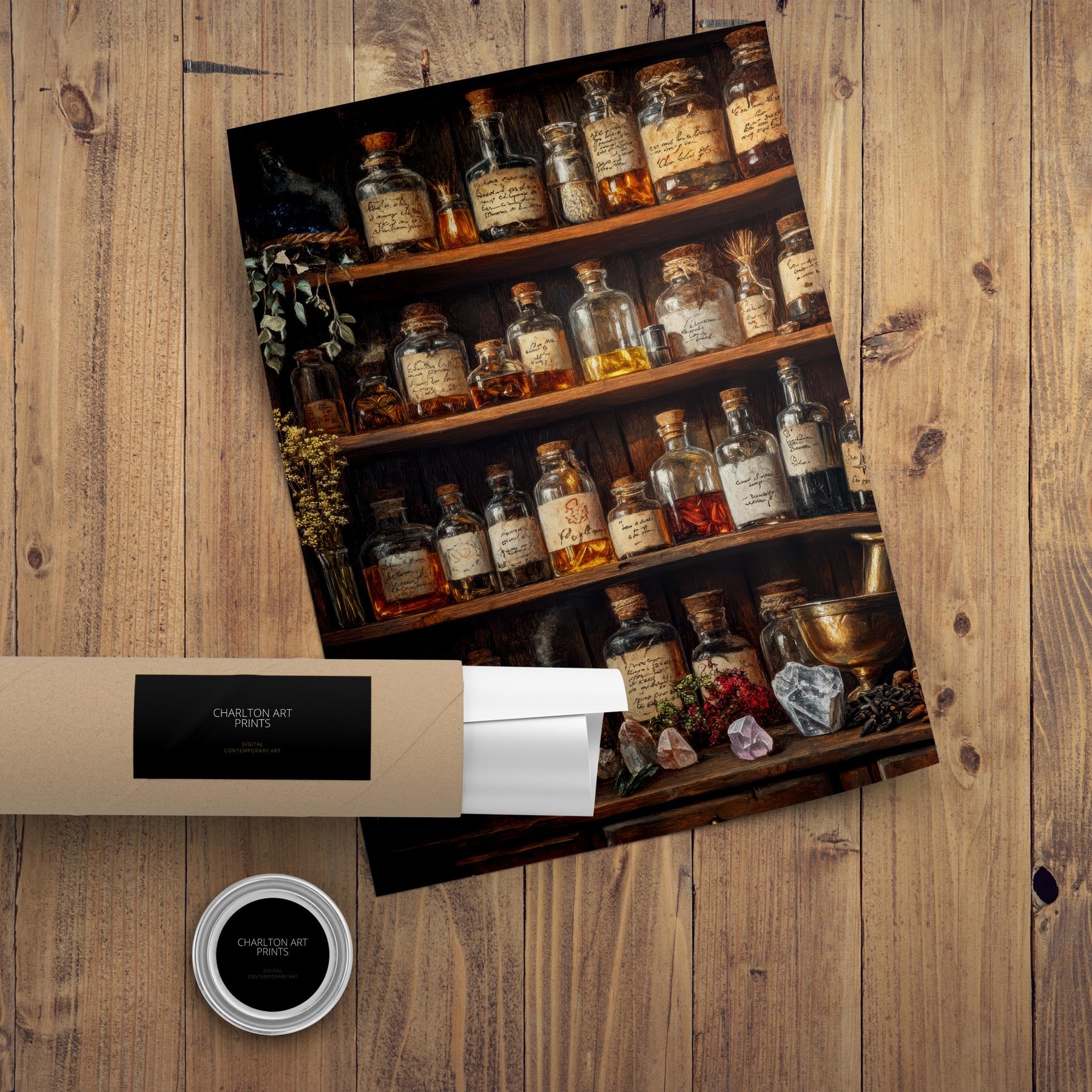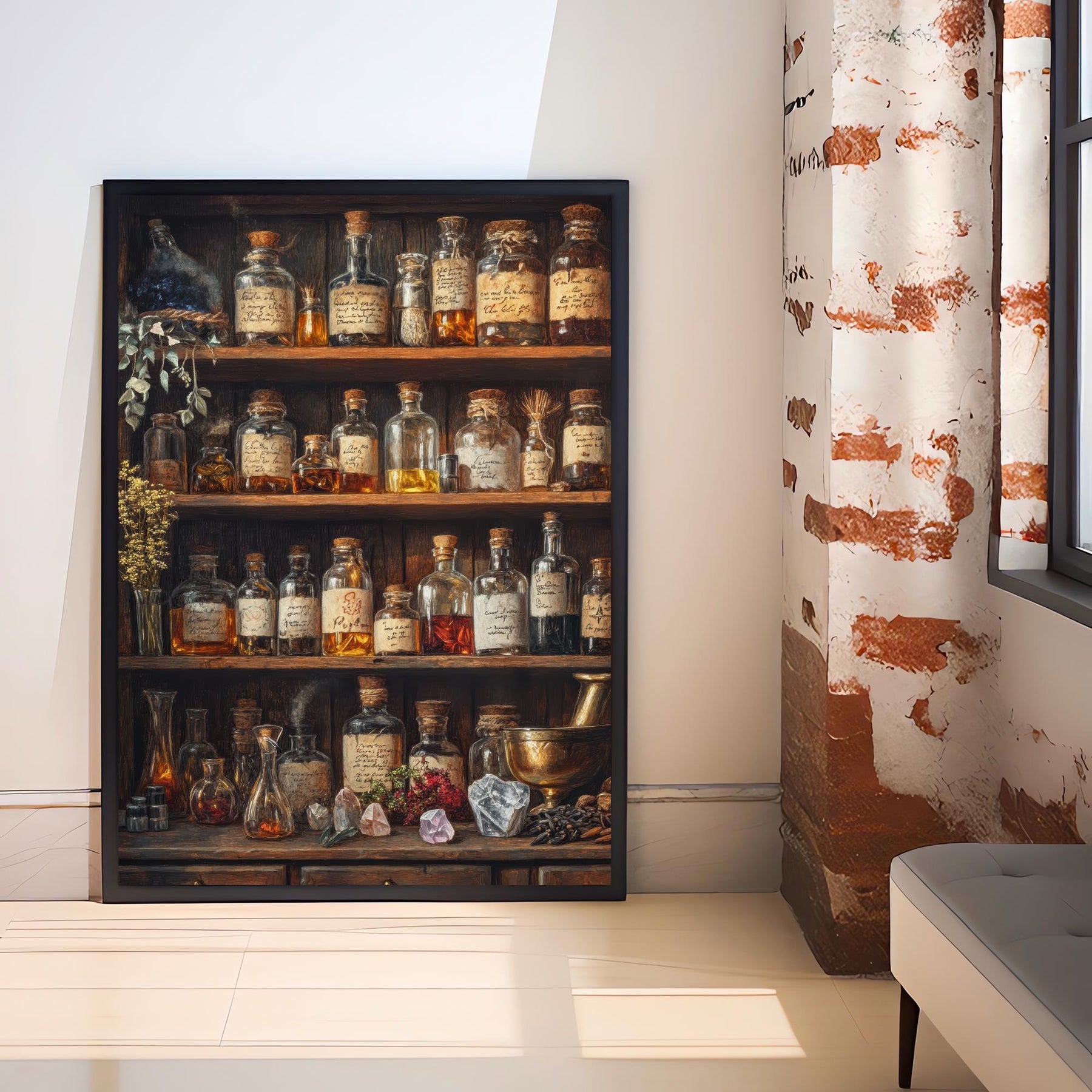 Wizards Potion Shelf Art Print Cottagecore Decor Mystical Apothecary Wall Art Vintage Nature Poster for Cozy Homes and Magical Inspired