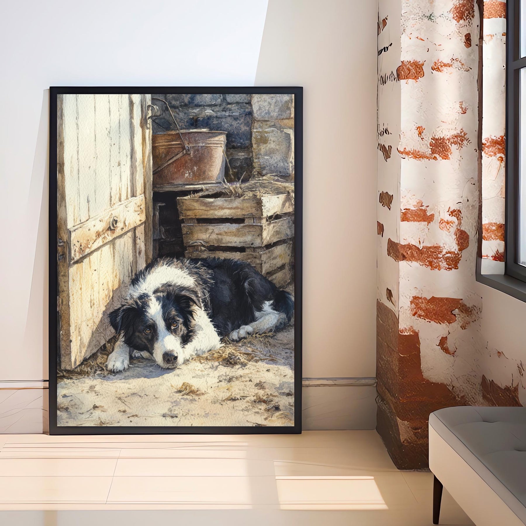 Embrace the loyal and gentle spirit of the countryside with our Border Collie Watercolor Print, a stunning piece that artfully combines the rustic charm of cottagecore with the intellectual depth of dark academia. This vintage-inspired illustration features a faithful Border Collie resting peacefully in a sun-dappled barn, evoking a sense of tranquil moments, loyal companionship, and the simple beauty of rural life.