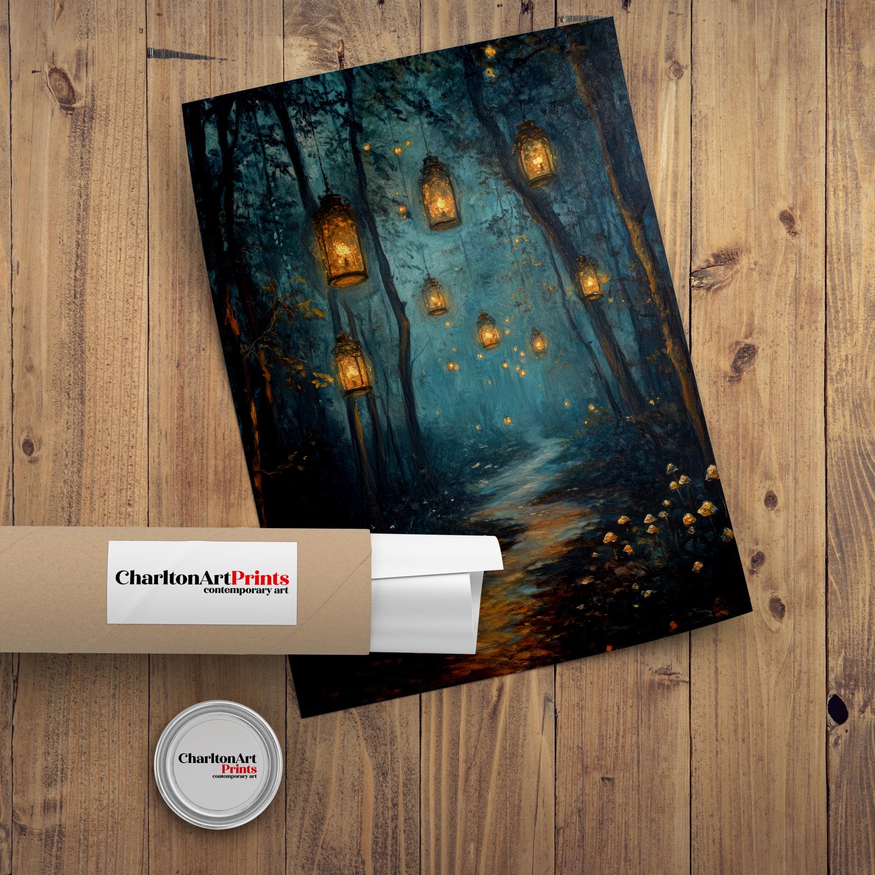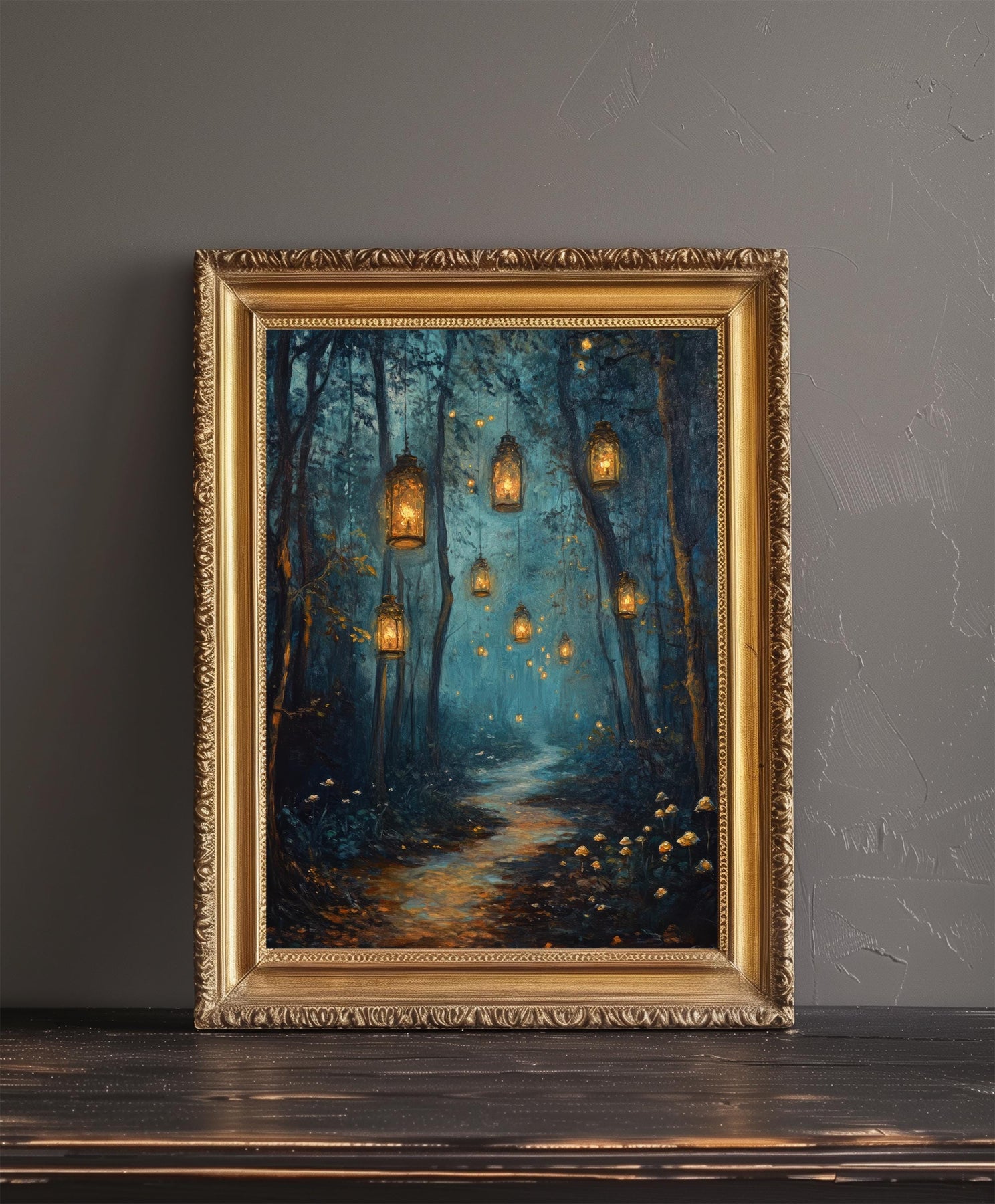 Magical Lantern Path Poster Enchanted Forest Art Cottagecore Decor Whimsical Woodland Illustration