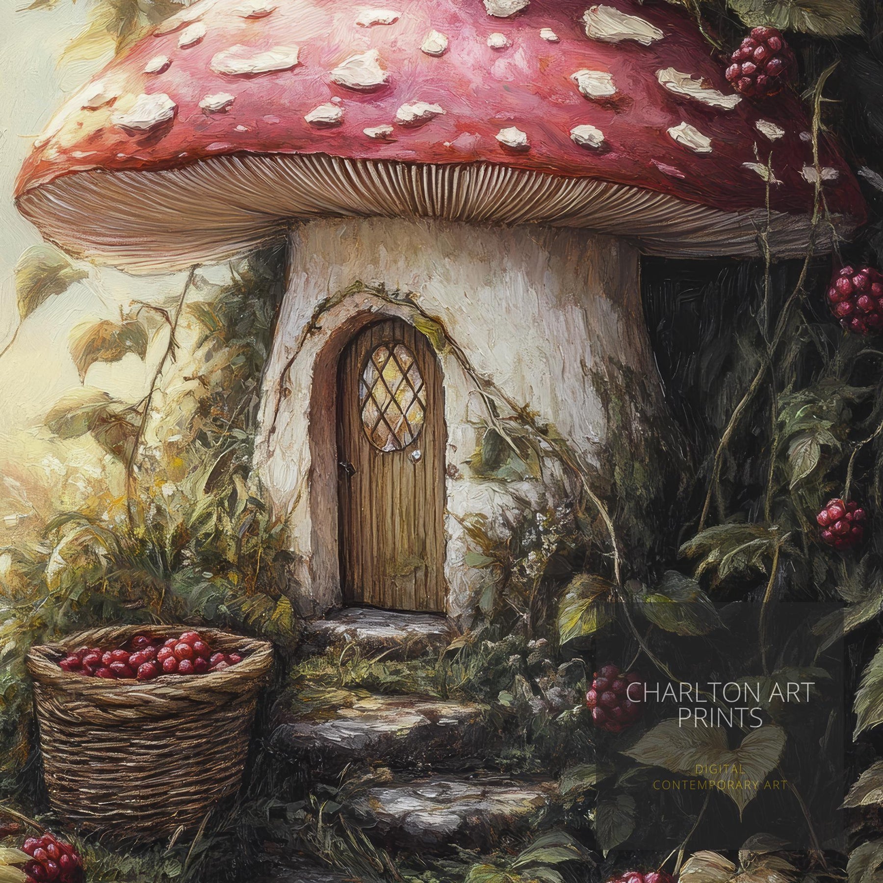 Wander down a magical forest path with this Raspberry Lane Toadstool Cottage Art Print. Featuring a charming mushroom-shaped cottage nestled along a raspberry-lined lane, this artwork captures the sweet whimsy of cottagecore living with a fairy tale twist. Perfect for lovers of enchanted gardens, rustic fantasy homes, and nature-inspired décor, this vintage-style print brings warmth, wonder, and charm to any cozy space.