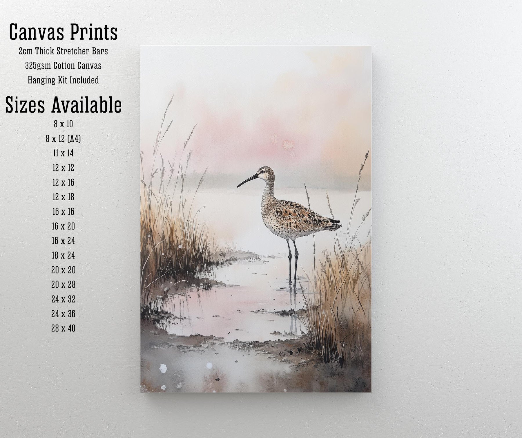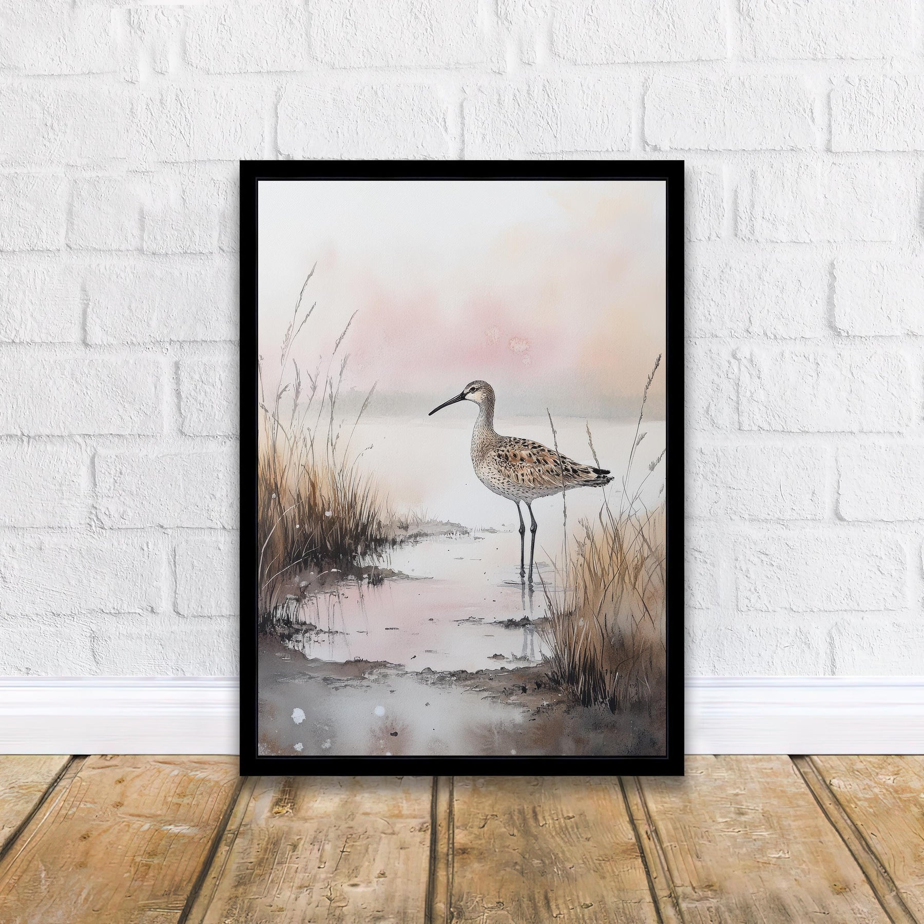 Step into a moment of serene tranquility with our Shorebird Marshland Watercolor Print, a captivating piece that beautifully blends the rustic charm of cottagecore with the intellectual depth of dark academia. This vintage-inspired illustration features a graceful long-beaked shorebird standing peacefully in a misty marsh, evoking a sense of calm, timelessness, and the quiet beauty of nature.