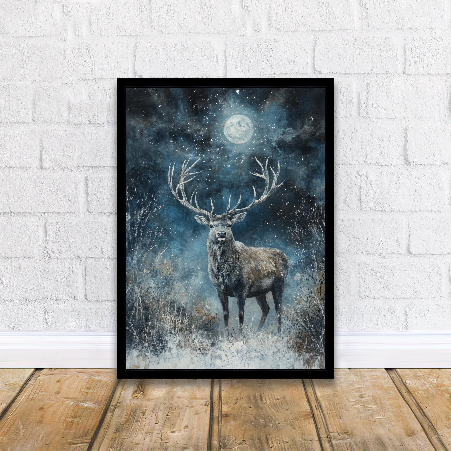Step into a mystical winter scene with our Stag in Moonlight Poster, a captivating piece of wall art that blends rustic charm with an intellectual, dark academia aesthetic. This enchanting illustration features a majestic stag standing beneath a full, glowing moon on a starry night, evoking a sense of serenity, mystery, and the quiet magic of the forest. It's the perfect piece to add a touch of timeless elegance and vintage charm to your study, living room, or cozy nook. Printed on high-quality, eco-friendly paper, this artwork is both visually stunning and a sustainable choice.
