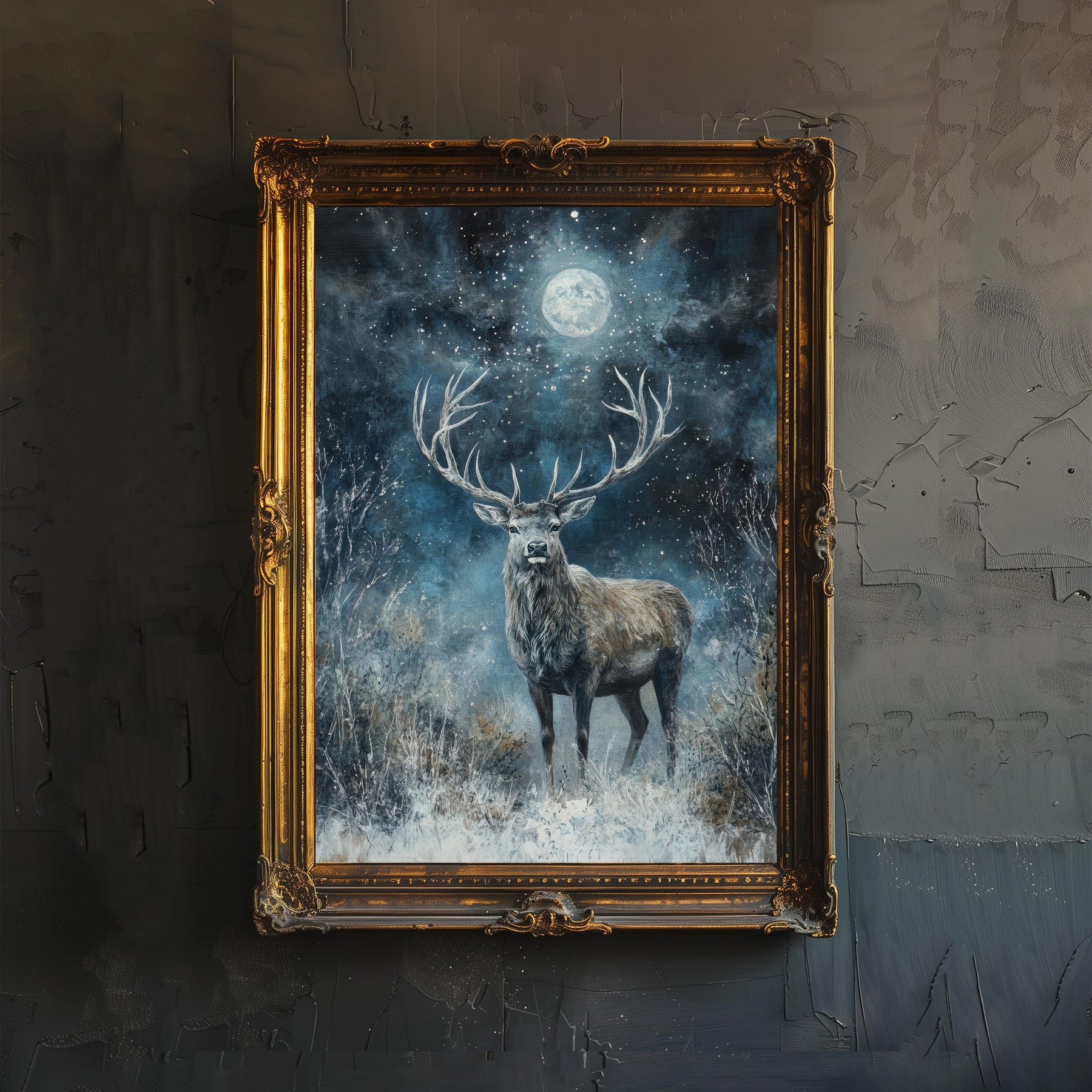 Stag in Moonlight Poster Dark Academia Decor Enchanted Wildlife Art Mystical Woodland Illustration