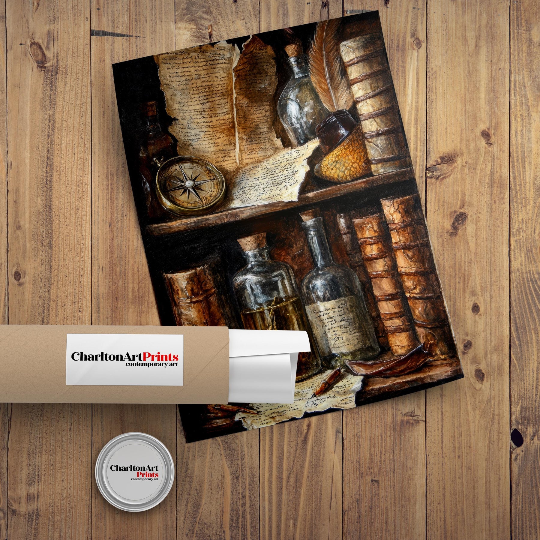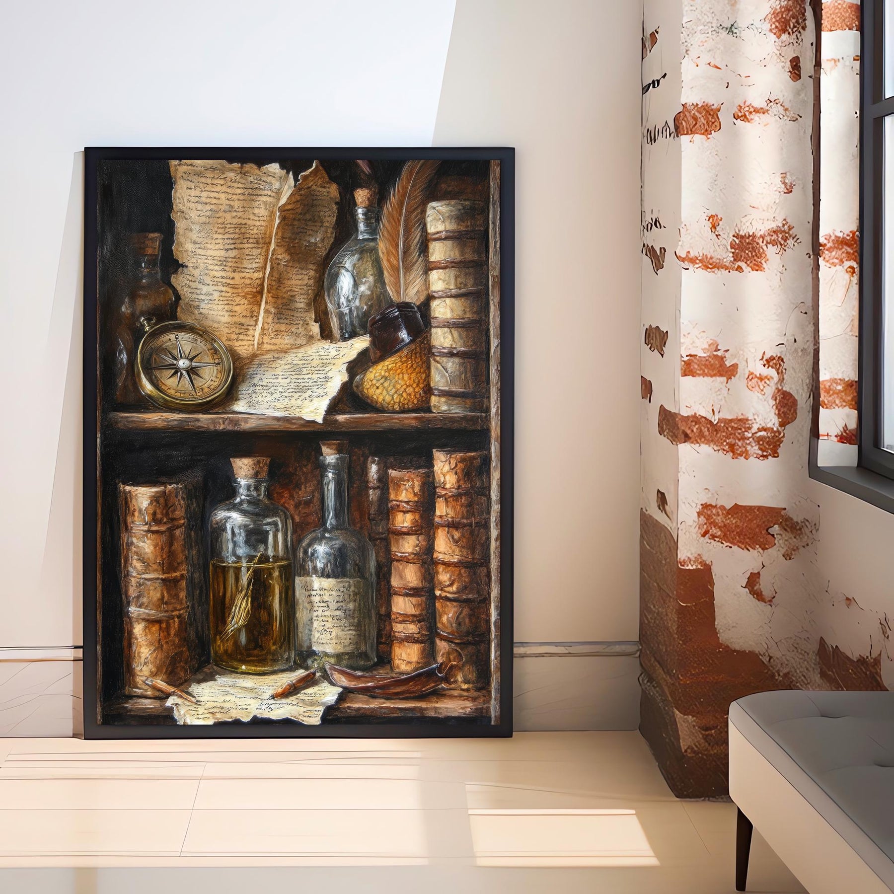 Step into a world of intellectual charm and mystery with our Vintage Bookshelf Still Life Poster. This captivating artwork beautifully embodies the classic, scholarly allure of dark academia. It features a beautifully detailed bookshelf filled with antique books, a compass, old scrolls, and glass bottles, evoking a sense of ancient knowledge and quiet discovery. Perfect for adding a timeless, rustic elegance to your study, library, or cozy nook. Printed on high-quality, eco-friendly paper, this artwork is both visually stunning and a sustainable choice.